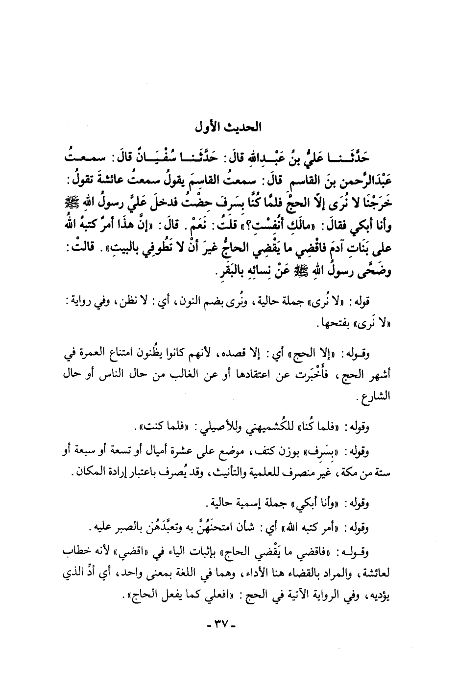 حَدَّثَنَا عَلِيُّ بْنُ عَبْدِ اللَّهِ قَالَ: حَدَّثَنَا سُفْيَانُ قَالَ: سَمِعْتُ عَبْدَ الرَّحْمَنِ بْنَ الْقَاسِمِ قَالَ: سَمِعْتُ الْقَاسِمَ يَقُولُ سَمِعْتُ عَائِشَةَ تَقُولُ: خَرَجْنَا لاَ نَرَى إِلاَّ الْحَجَّ، فَلَمَّا كُنَّا بِسَرِفَ حِضْتُ، فَدَخَلَ عَلَيَّ رَسُولُ اللَّهِ -صلى الله عليه وسلم- وَأَنَا أَبْكِي قَالَ: "مَا لَكِ أَنُفِسْتِ؟ ". قُلْتُ: نَعَمْ. قَالَ: "إِنَّ هَذَا أَمْرٌ كَتَبَهُ اللَّهُ عَلَى بَنَاتِ آدَمَ، فَاقْضِي مَا يَقْضِي الْحَاجُّ، غَيْرَ أَنْ لاَ تَطُوفِي بِالْبَيْتِ". قَالَتْ: وَضَحَّى رَسُولُ اللَّهِ -صلى الله عليه وسلم- عَنْ نِسَائِهِ بِالْبَقَرِ.