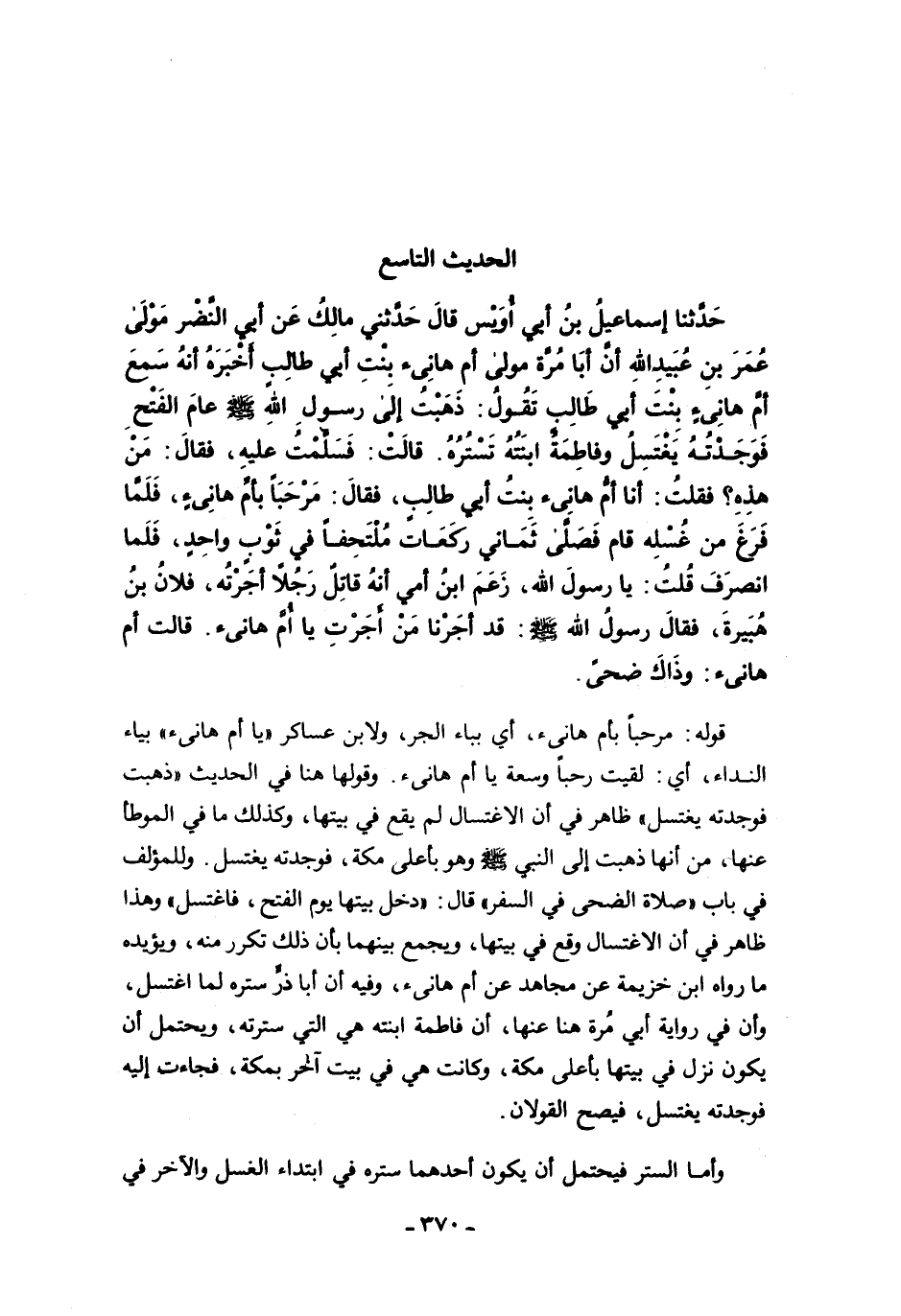 حَدَّثَنَا إِسْمَاعِيلُ بْنُ أَبِي أُوَيْسٍ قَالَ حَدَّثَنِي مَالِكُ عَنْ أَبِي النَّضْرِ مَوْلَى عُمَرَ بْنِ عُبَيْدِ اللَّهِ أَنَّ أَبَا مُرَّةَ مَوْلَى أُمِّ هَانِىء بِنْتِ أَبِي طَالِبٍ أَخْبَرَهُ أَنَّهُ سَمِعَ أُمَّ هَانِىء بِنْتَ أَبِي طَالِبٍ تَقُولُ: ذَهَبْتُ إِلَى رَسُولِ اللَّهِ -صلى الله عليه وسلم- عَامَ الْفَتْحِ، فَوَجَدْتُهُ يَغْتَسِلُ، وَفَاطِمَةُ ابْنَتُهُ تَسْتُرُهُ قَالَتْ: فَسَلَّمْتُ عَلَيْهِ، فَقَالَ: "مَنْ هَذِهِ؟ ". فَقُلْتُ: أَنَا أُمُّ هَانِىء بِنْتُ أَبِي طَالِبٍ. فَقَالَ: "مَرْحَبًا بِأُمِّ هَانِىء". فَلَمَّا فَرَغَ مِنْ غُسْلِهِ، قَامَ فَصَلَّى ثَمَانِي رَكَعَاتٍ، مُلْتَحِفًا فِي ثَوْبٍ وَاحِدٍ، فَلَمَّا انْصَرَفَ قُلْتُ: يَا رَسُولَ اللَّهِ، زَعَمَ ابْنُ أُمِّي أَنَّهُ قَاتِلٌ رَجُلاً قَدْ أَجَرْتُهُ، فُلاَنَ بْنَ هُبَيْرَةَ. فَقَالَ رَسُولُ اللَّهِ -صلى الله عليه وسلم- "قَدْ أَجَرْنَا مَنْ أَجَرْتِ يَا أُمَّ هَانِىء". قَالَتْ أُمُّ هَانِىء وَذَاكَ ضُحًى.