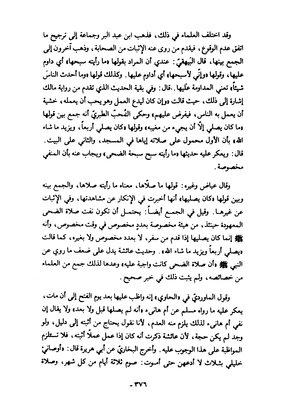 وقد اختلف العلماء في ذلك، فذهب ابن عبد البر وجماعة إلى ترجيح ما اتفق عدم الوقوع، فيقدم من روى عنه الإثبات من الصحابة، وذهب آخرون إلى الجمع بينها، قال البَيهقيّ: عندي أن المراد بقولها "ما رأيته سبحها" أي داوم عليها، وقولها "وإنّي لأسبحها" أي أداوم عليها. وكذلك قولها "وما أحدث الناسَ شيئًا" تعني المداومة عليها.، قال: وفي بقية الحديث الذي تقدم من رواية مالك إشارة إلى ذلك، حيث قالت "وإن كان ليدع العمل وهو يحب أن يعمله، خشية أن يعمل به الناس، فيفرض عليهم" وحكى المحُبّ الطبريّ أنه جمع بين قولها "ما كان يصلي إلَّا أن يجيء من مغيبه" وقولها "كان يصلي أربعاً، ويزيد ما شاء الله" بأن الأول محمول على صلاته اياها في المسجد، والثاني على البيت. قال: ويعكر عليه حديثها "ما رأيته سبح سبحة الضحى" ويجاب عنه بأن المنفي مخصوصة.