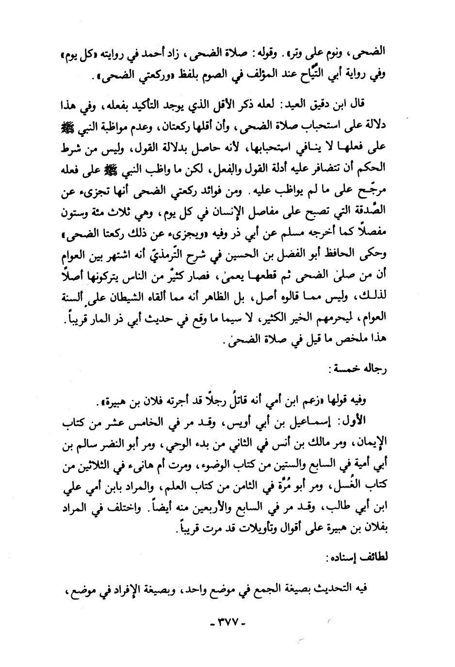قال ابن دقيق العيد: لعله ذكر الأقل الذي يوجد التأكيد بفعله، وفي هذا دلالة على استحباب صلاة الضحى، وأن أقلها ركعتان، وعدم مواظبة النبي -صلى الله عليه وسلم- على فعلها لا ينافي استحبابها، لأنه حاصل بدلالة القول، وليس من شرط الحكم أن تتضافر عليه أدلة القول والفعل، لكن ما واظب النبي -صلى الله عليه وسلم- على فعله مرجّح على ما لم يواظب عليه، ومن فوائد ركعتي الضحى أنها تجزىء عن الصَّدقة التي تصبح على مفاصل الإنسان في كل يوم، وهي ثلاث مئة وستون مفصلًا كما أخرجه مسلم عن أبي ذر وفيه "ويجزىء عن ذلك ركعتا الضحى" وحكى الحافظ أبو الفضل بن الحسين في شرح التّرمذيّ أنه اشتهر بين العوام أن من صلى الضحى ثم قطعها يعمى، فصار كثيرٌ من الناس يتركونها أصلًا لذلك، وليس مما قالوه أصل، بل الظاهر أنه مما ألقاه الشيطان على ألسنة العوام، ليحرمهم الخير الكثير، لاسيما ما وقع في حديث أبي ذر المار قريبًا. هذا ملخص ما قيل في صلاة الضحى.