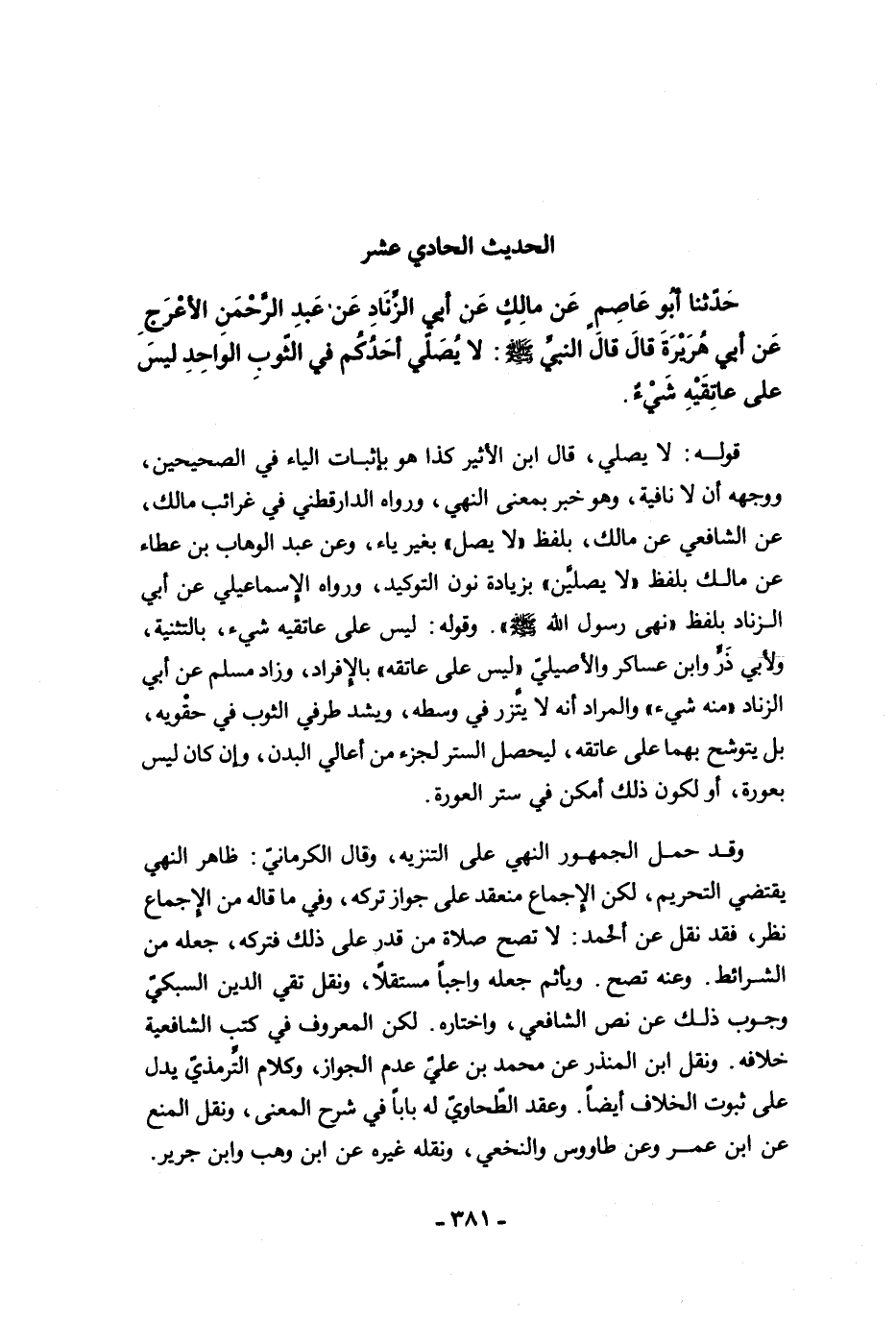 حَدَّثَنَا أَبُو عَاصِمٍ عَنْ مَالِكٍ عَنْ أَبِي الزِّنَادِ عَنْ عَبْدِ الرَّحْمَنِ الأَعْرَجِ عَنْ أَبِي هُرَيْرَةَ قَالَ قَالَ النَّبِيُّ -صلى الله عليه وسلم-: "لاَ يُصَلِّى أَحَدُكُمْ فِي الثَّوْبِ الْوَاحِدِ، لَيْسَ عَلَى عَاتِقَيْهِ شَيْءٌ".