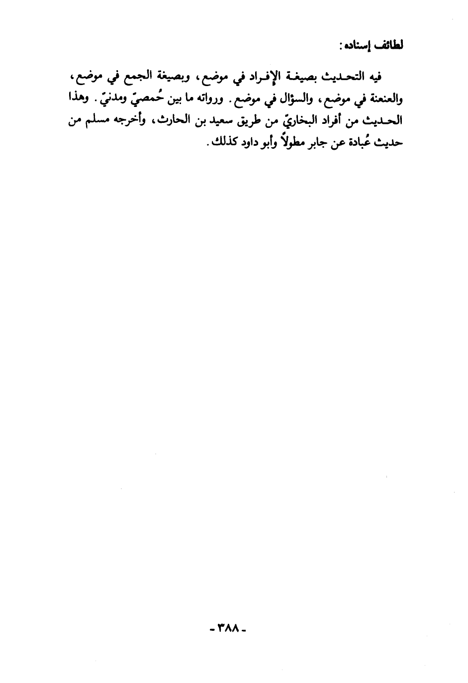 فيه التحديث بصيغة الإفراد في موضع، وبصيغة الجمع في موضع، والعنعنة في موضع، والسؤال في موضع. ورواته ما بين حُمصيّ ومدنيّ. وهذا الحديث من أفراد البخاريّ من طريق سعيد بن الحارث، وأخرجه مسلم من حديث عبادة عن جابر مطولًا وأبو داود كذلك.