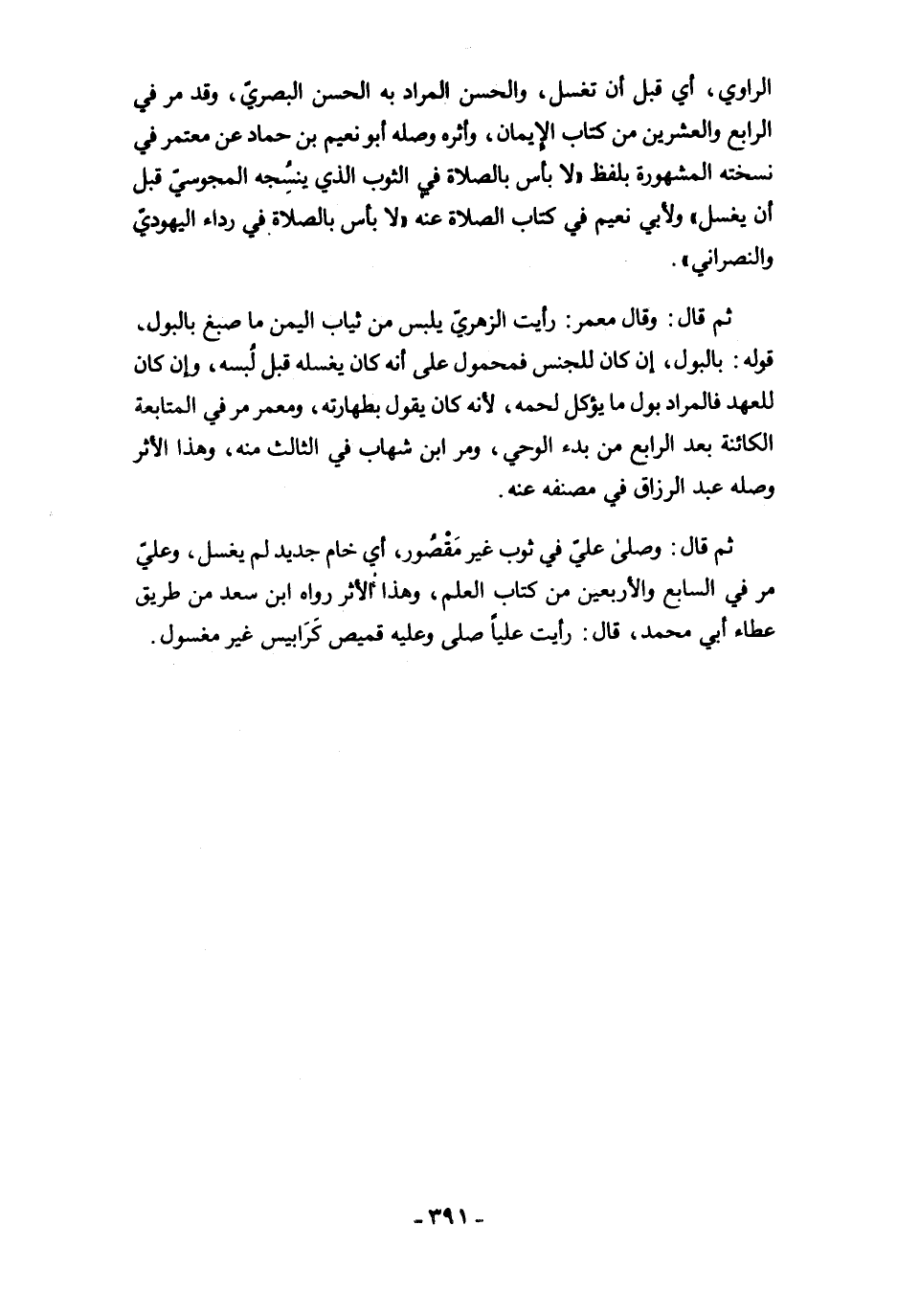 ثم قال: وصلى عليّ في ثوب غير مَقْصُور، أي خام جديد لم يغسل، وعليّ مرَّ في السابع والأربعين من كتاب العلم، وهذا الأثر رواه ابن سعد من طريق عطاء أبي محمد، قال: رأيت عليًا صلى وعليه قميص كَرَابيس غير مغسول.