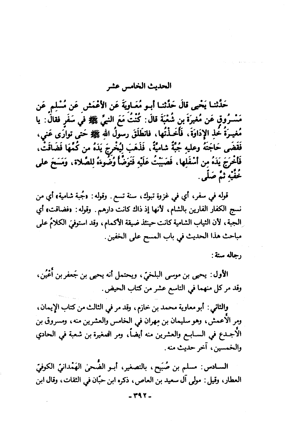 والثاني: أبو معاوية محمد بن خازم، وقد مرَّ في الثالث من كتاب الإيمان، ومرَّ الأَعمش، وهو سليمان بن مهران في الخامس والعشرين منه، ومسروق بن الأَجدع في السابع والعشرين منه أيضًا، ومرَّ المغيرة بن شعبة في الحادي والخمسين، آخر حديث منه.
