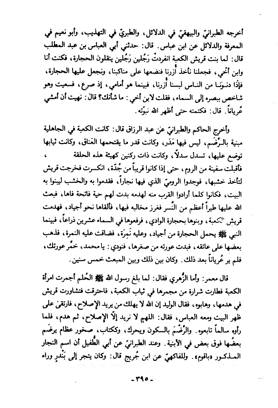أخرجه الطبرانيّ والبيهقيّ في الدلائل، والطبريّ في التهذيب، وأبو نعيم في المعرفة والدلائل عن ابن عباس. قال: حدثني أبي العباس بن عبد المطلب قال: لما بنت قريش الكعبة انفردتْ رَجُلبن رَجُلين ينقلون الحجارة، فكنت أنا وابن أخْي، فجعلنا نأخذ أُزرنا فنضعها على مناكبنا، ونجعل عليها الحجارة، فإذا دنونا من الناس لبسنا أُزرنا، فبينا هو أمامي، إذ صرع، فسعيت وهو شاخص ببصره إلى السماء، فقلت لابن أخي: ما شأنك؟ قال: نهيت أن أمشي عُريانًا. قال: فكتمته حتى أظهر الله نبوّته.