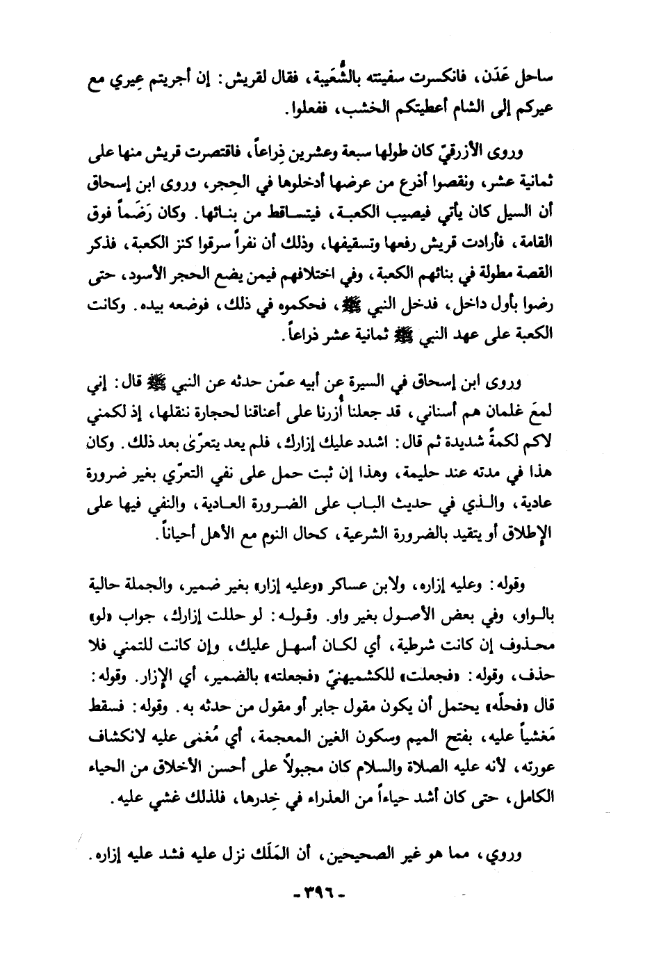 وروى ابن إسحاق في السيرة عن أبيه عمّن حدثه عن النبي -صلى الله عليه وسلم- قال: إني لمعَ غلمان هم أسناني، قد جعلنا أُزرنا على أعناقنا لحجارة ننقلها، إذ لكمني لاكم لكمةٌ شديدة ثم قال: اشدد عليك إزارك، فلم يعد يتعرّى بعد ذلك. وكان هذا في مدته عند حليمة، وهذا ان ثبت حمل على نفي التعرّي بغير ضرورة عادية، والذي في حديث الباب على الضرورة العادية، والنفي فيها على الإطلاق أو يتقيد بالضرورة الشرعية، كحال النوم مع الأهل أحيانًا.