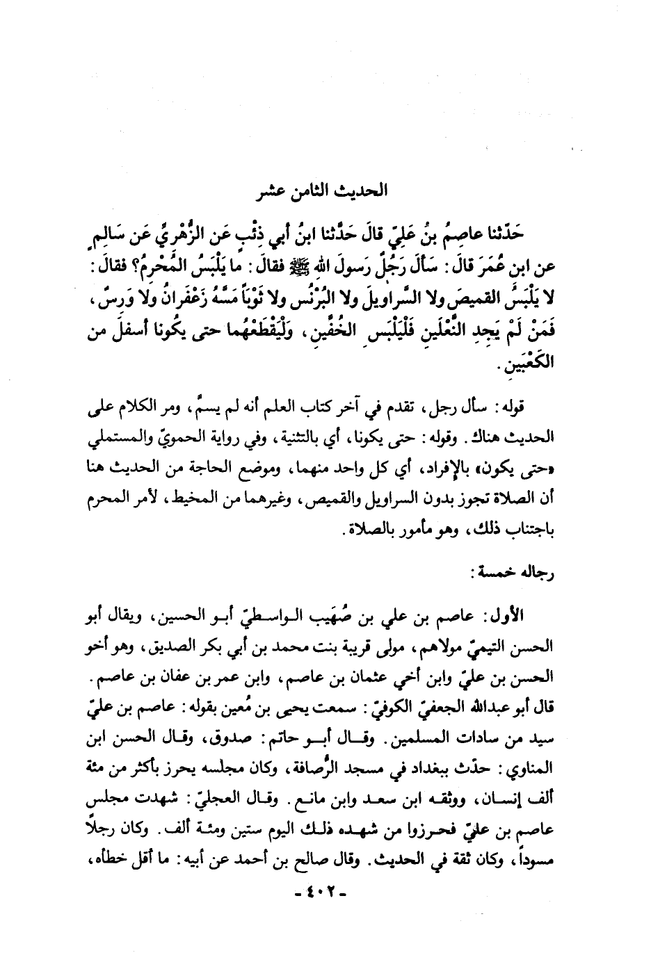 حَدَّثَنَا عَاصِمُ بْنُ عَلِيٍّ قَالَ حَدَّثَنَا ابْنُ أَبِي ذِئْبٍ عَنِ الزُّهْرِيِّ عَنْ سَالِمٍ عَنِ ابْنِ عُمَرَ قَالَ: سَأَلَ رَجُلٌ رَسُولَ اللَّهِ -صلى الله عليه وسلم- فَقَالَ: مَا يَلْبَسُ الْمُحْرِمُ؟ فَقَالَ: "لاَ يَلْبَسُ الْقَمِيصَ وَلاَ السَّرَاوِيلَ وَلاَ الْبُرْنُسَ وَلاَ ثَوْبًا مَسَّهُ الزَّعْفَرَانُ وَلاَ وَرْسٌ، فَمَنْ لَمْ يَجِدِ النَّعْلَيْنِ فَلْيَلْبَسِ الْخُفَّيْنِ وَلْيَقْطَعْهُمَا حَتَّى يَكُونَا أَسْفَلَ مِنَ الْكَعْبَيْنِ".