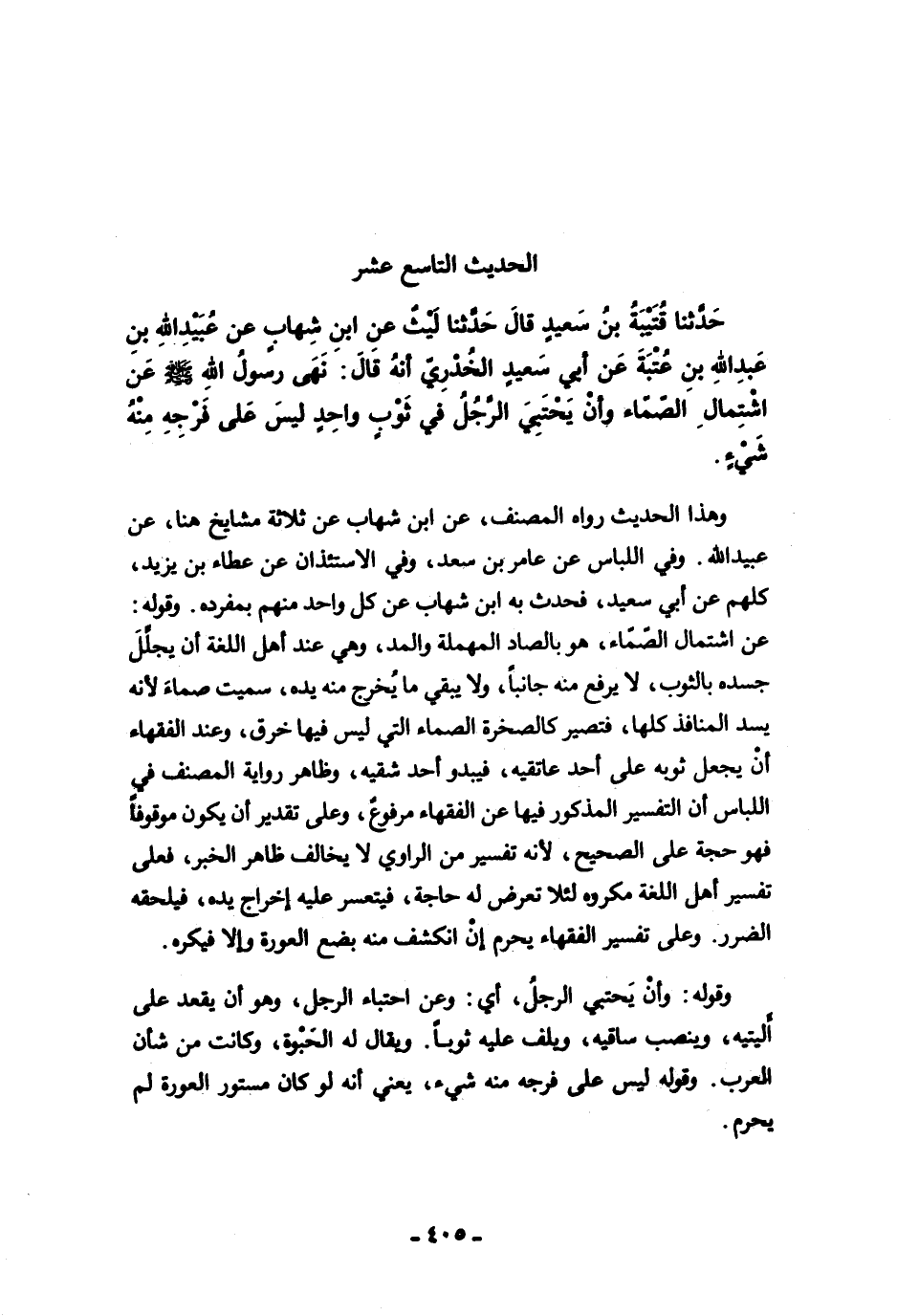 حَدَّثَنَا قُتَيْبَةُ بْنُ سَعِيدٍ قَالَ حَدَّثَنَا لَيْثٌ عَنِ ابْنِ شِهَابٍ عَنْ عُبَيْدِ اللَّهِ بْنِ عَبْدِ اللَّهِ بْنِ عُتْبَةَ عَنْ أَبِي سَعِيدٍ الْخُدْرِيِّ أَنَّهُ قَالَ: نَهَى رَسُولُ اللَّهِ -صلى الله عليه وسلم- عَنِ اشْتِمَالِ الصَّمَّاءِ وَأَنْ يَحْتَبِيَ الرَّجُلُ فِي ثَوْبٍ وَاحِدٍ، لَيْسَ عَلَى فَرْجِهِ مِنْهُ شَيْءٌ.