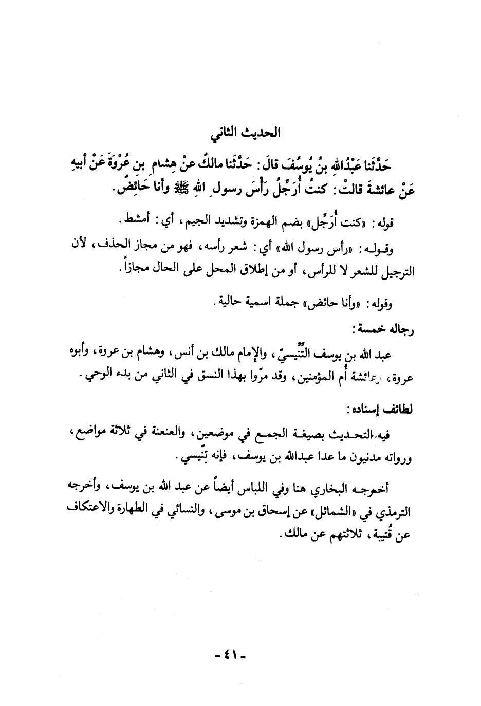 حَدَّثَنَا عَبْدُ اللَّهِ بْنُ يُوسُفَ قَالَ: حَدَّثَنَا مَالِكٌ عَنْ هِشَامِ بْنِ عُرْوَةَ عَنْ أَبِيهِ عَنْ عَائِشَةَ قَالَتْ: كُنْتُ أُرَجِّلُ رَأْسَ رَسُولِ اللَّهِ -صلى الله عليه وسلم- وَأَنَا حَائِضٌ.