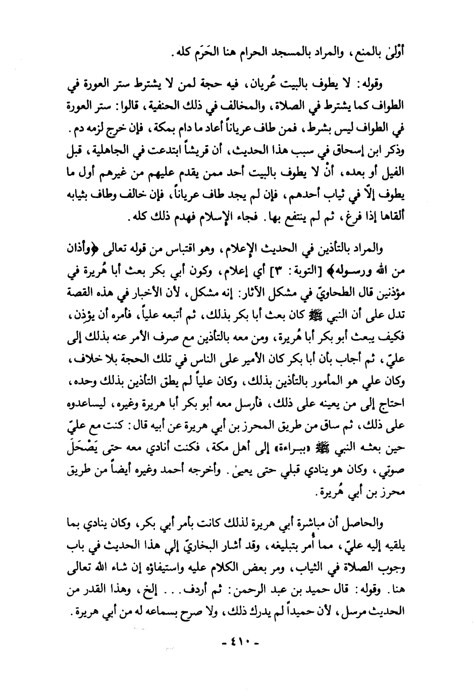 وقوله: لا يطوف بالبيت عُريان، فيه حجة لمن لايشترط ستر العورة في الطواف كما يشترط في الصلاة، والمخالف في ذلك الحنفية، قالوا: ستر العورة في الطواف ليس بشرط، فمن طاف عريانًا أعاد ما دام بمكة، فإن خرج لزمه دم. وذكر ابن اسحاق في سبب هذا الحديث، أن قريشًا ابتدعت في الجاهلية، قبل الفيل أو بعده، أنْ لا يطوف بالبيت أحد ممن يقدم عليهم من غيرهم أول ما يطوف إلاّ في ثياب أحدهم، فإن لم يجد طاف عريانًا، فإن خالف وطاف بثيابه ألقاها إذا فرغ، ثم لم ينتفع بها. فجاء الإسلام فهدم ذلك كله.