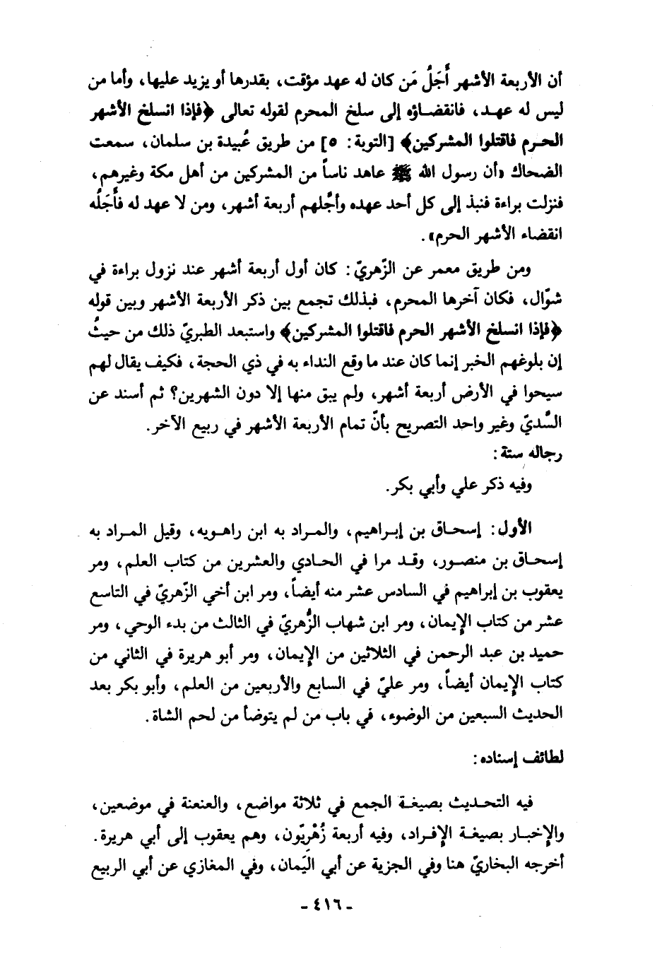 ومن طريق معمر عن الزّهريّ: كان أول أربعة أشهر عند نزول براءة في شوّال، فكان آخرها المحرم، فبذلك تجمع بين ذكر الأربعة الأشهر وبين قوله {فَإِذَا انْسَلَخَ الْأَشْهُرُ الْحُرُمُ فَاقْتُلُوا الْمُشْرِكِينَ} واستبعد الطبريّ ذلك من حيثُ إن بلوغهم الخبر إنما كان عندما وقع النداء به في ذي الحجة، فكيف يقال لهم سيحوا في الأرض أربعة أشهر، ولم يبق منها إلا دون الشهرين؟ ثم أسند عن السُّديّ وغير واحد التصريح بأنّ تمام الأربعة الأشهر في ربيع الآخر.