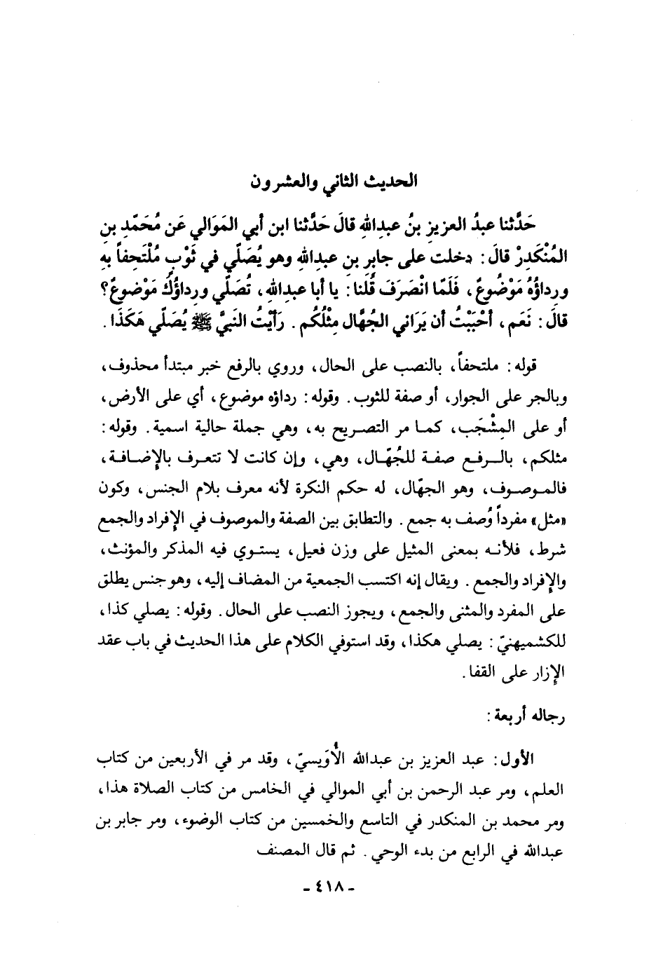 الأول: عبد العزيز بن عبد الله الأُوَيسيّ، وقد مرّ في الأربعين من كتاب العلم، ومرّ عبد الرحمن بن أبي الموالي في الخامس من كتاب الصلاة هذا، ومرّ محمد بن المنكدر في التاسع والخمسين من كتاب الوضوء، ومرّ جابر بن عبد الله في الرابع من بدء الوحي. ثم قال المصنف