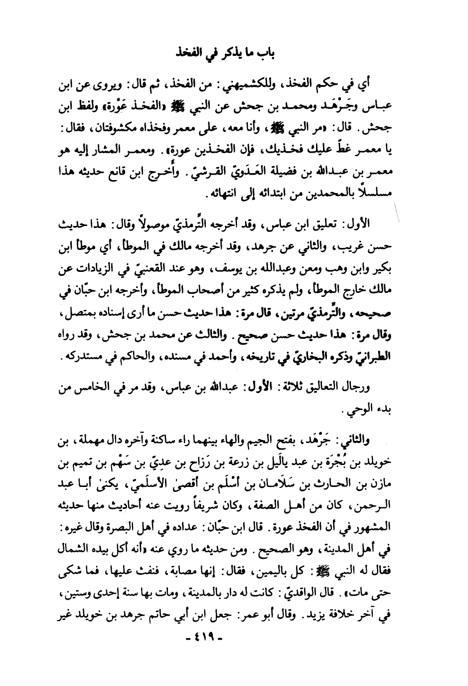 الأول: تعليق ابن عباس، وقد أخرجه التِّرمذي موصولًا وقال: هذا حديث حسن غريب، والثاني عن جرهد، وقد أخرجه مالك في الموطأ، أي موطأ ابن بكير وابن وهب ومعن وعبد الله بن يوسف، وهو عند القعنبيّ في الزيادات عن مالك خارج الموطأ، ولم يذكره كثير من أصحاب الموطأ، وأخرجه ابن حبّان في صحيحه، والتِّرمذيّ مرتين، قال مرة: هذا حديث حسن ما أرى إسناده بمتصل، وقال مرة: هذا حديث حسن صحح. والثالث عن محمد بن جحش، وقد رواه الطبرانيّ وذكر البخاريّ في تاريخه، وأحمد في مسنده، والحاكم في مستدركه.