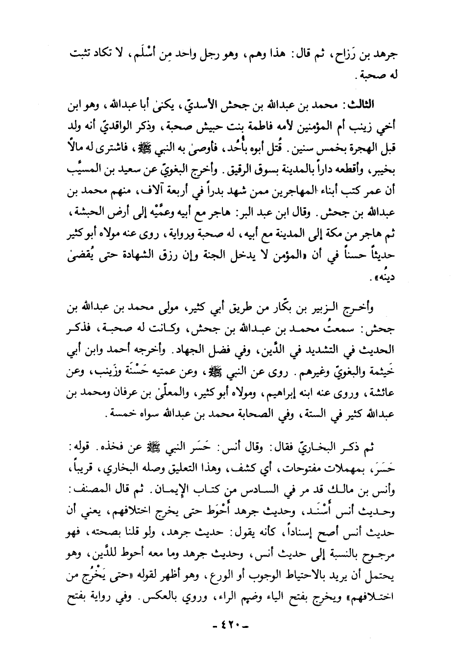 الثالث: محمد بن عبد الله بن جحش الأسديّ، يكنى أبا عبد الله، وهو ابن أخي زينب أم المؤمنين لأمه فاطمة بنت حبيش صحبة، وذكر الواقديّ أنه ولد قبل الهجرة بخمس سنين. قُتل أبوه بأُحُد، فأوصى به النبي -صلى الله عليه وسلم-، فاشترى له مالًا بخيبر، وأقطعه دارًا بالمدينة بسوق الرقيق. وأخرج البغويّ عن سعيد بن المسيَّب أن عمر كتب أبناء المهاجرين ممن شهد بدرًا في أربعة آلاف، منهم محمد بن عبد الله بن جحش. وقال ابن عبد البر: هاجر مع أبيه وعمَّيْه إلى أرض الحبشة، ثم هاجر من مكة إلى المدينة مع أبيه، له صحبة ورواية، روى عنه مولاه أبو كثير حديثًا حسنًا في أن "المؤمن لا يدخل الجنة وإن رزق الشهادة حتى يُقضى دينُه".