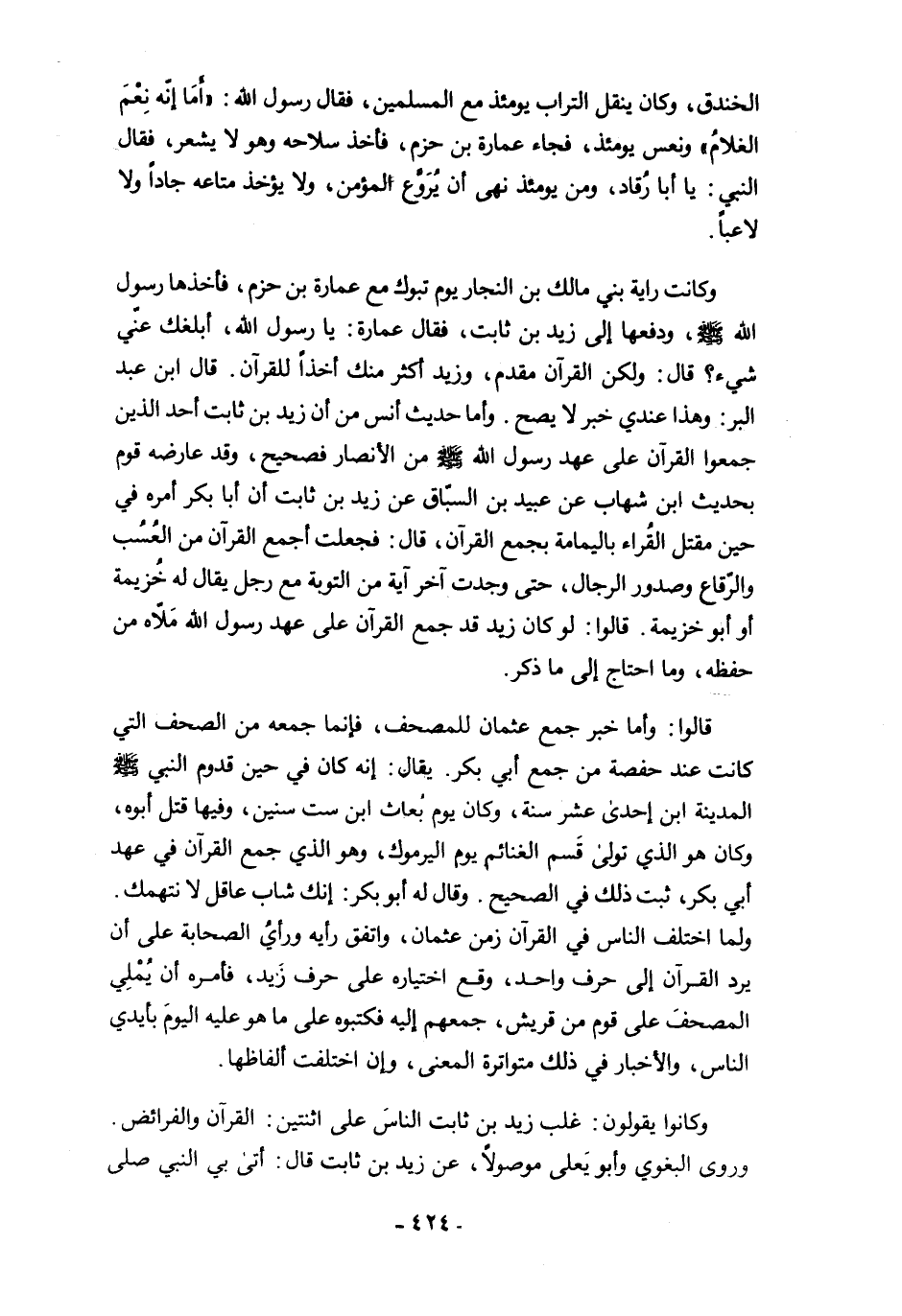 قالوا: وأما خبر جمع عثمان للمصحف، فإنما جمعه من الصحف التي كانت عند حفصة من جمع أبي بكر. يقال: إنه كان في حين قدوم النبي -صلى الله عليه وسلم- المدينة ابن إحدى عشر سنة، وكان يوم بُعاث ابن ست سنين، وفيها قتل أبوه، وكان هو الذي تولى قَسم الغنائم يوم اليرموك، وهو الذي جمع القرآن في عهد أبي بكر، ثبت ذلك في الصحيح. وقال له أبو بكر: إنك شاب عاقل لا نتهمك. ولما اختلف الناس في القرآن زمن عثمان، واتفق رأيه ورأيُ الصحابة على أن يرد القرآن إلى حرف واحد، وقع اختياره على حرف زَيد، فأمره أن يُمْلِي المصحفَ على قوم من قريش، جمعهم إليه فكتبوه على ما هو عليه اليومَ بأيدي الناس، والأخبار في ذلك متواترة المعنى، وإن اختلفت ألفاظها.