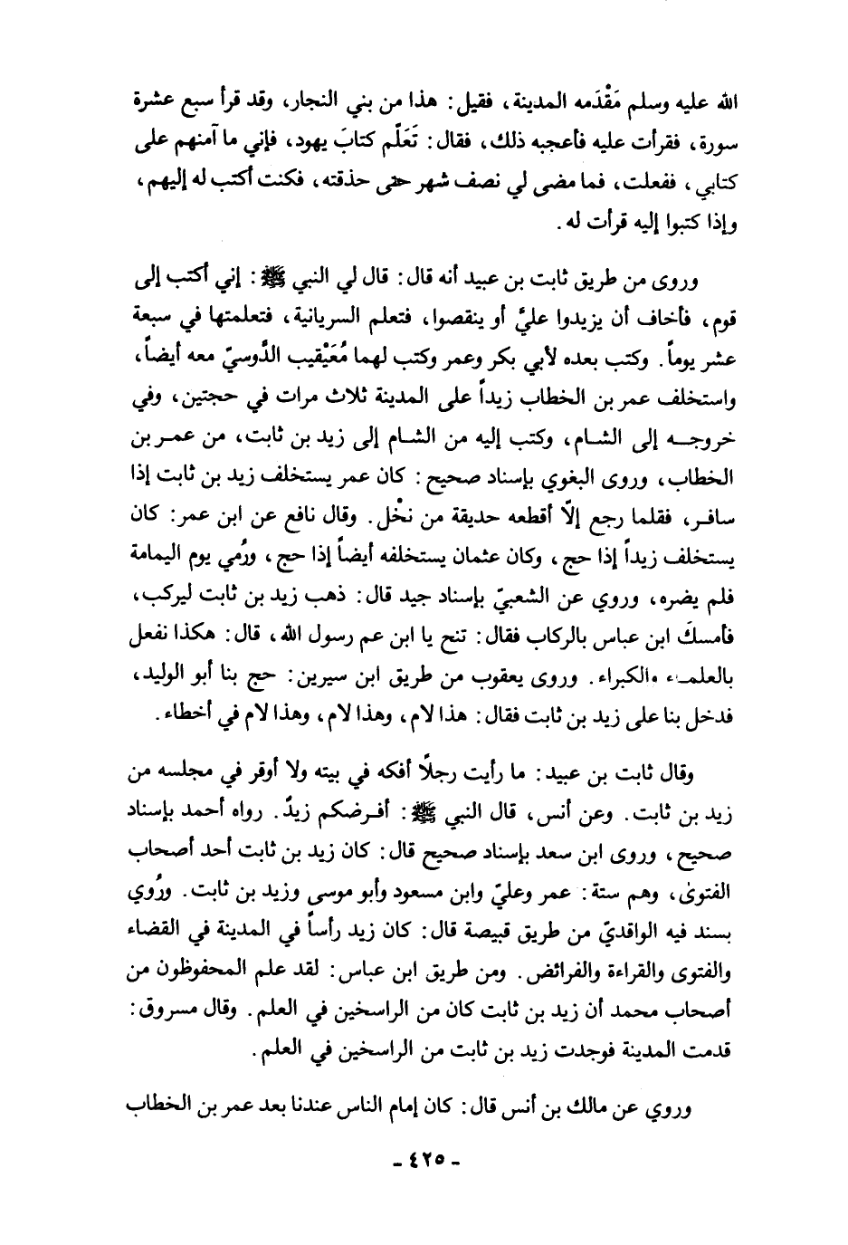 وروى من طريق ثابت بن عبيد أنه قال: قال لي النبي -صلى الله عليه وسلم-: إني أكتب إلى قوم، فأخاف أن يزيدوا عليّ أو ينقصوا، فتعلم السريانية، فتعلمتها في سبعة عشر يومًا. وكتب بعده لأبي بكر وعمر وكتب لهما مُعَيْقيب الدَّوسيّ معه أيضًا، واستخلف عمر بن الخطاب زيدًا على المدينة ثلاث مرات في حجتين، وفي خروجه إلى الشام، وكتب إليه من الشام إلى زيد بن ثابت، من عمر بن الخطاب، وروى البغوي بإسناد صحيح: كان عمر يستخلف زيد بن ثابت إذا سافر، فقلما رجع إلَّا أقطعه حديقة من نخْل. وقال نافع عن ابن عمر: كان يستخلف زيدًا إذا حج، وكان عثمان يستخلفه أيضًا إذا حج، ورُمي يوم اليمامة فلم يضره، وروي عن الشعبيّ بإسناد جيد قال: ذهب زيد بن ثابت ليركب، فأمسكَ ابن عباس بالركاب فقال: تنح يا ابن عم رسول الله، قال: هكذا نفعل بالعلماء والكبراء. وروى يعقوب من طريق ابن سيرين: حج بنا أبو الوليد، فدخل بنا على زيد بن ثابت فقال: هذا لام، وهذا لام، وهذا لام في أخطاء.