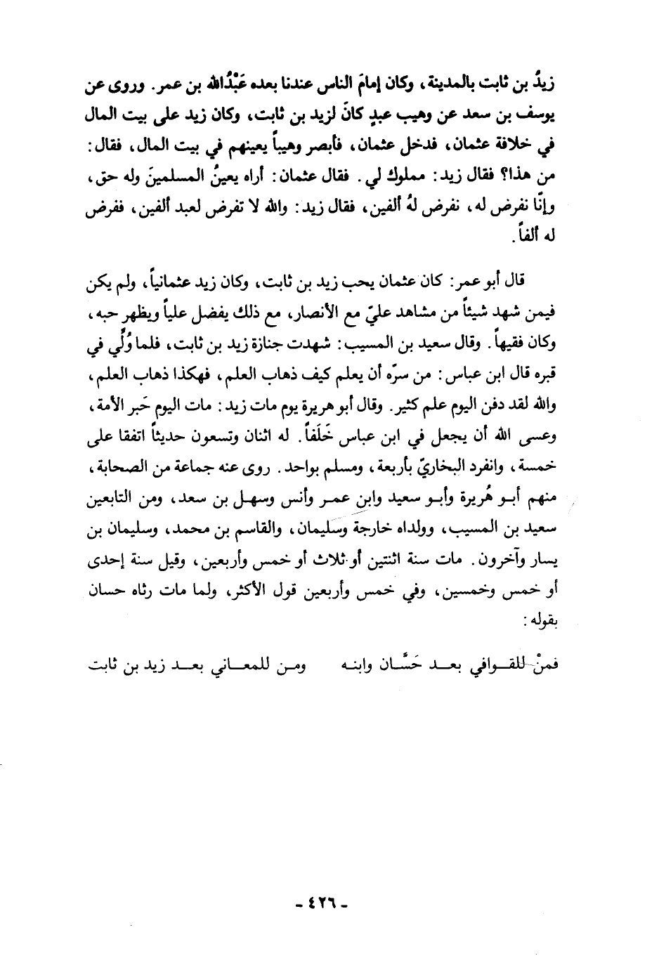 قال أبو عمر: كان عثمان يحب زيد بن ثابت، وكان زيد عثمانيًا، ولم يكن فيمن شهد شيئًا من مشاهد عليّ مع الأنصار، مع ذلك يفضل عليًا ويظهر حبه، وكان فقيهًا. وقال سعيد بن المسيب: شهدت جنازة زيد بن ثابت، فلما وُلَّي في قبره قال ابن عباس: من سرّه أن يعلم كيف ذهاب العلم، فهكذا ذهاب العلم، والله لقد دفن اليوم علم كثير. وقال أبو هريرة يوم مات زيد: مات اليوم حَبر الأمة، وعسى الله أن يجعل في ابن عباس خَلَفًا. له اثنان وتسعون حديثًا اتفقا على خمسة، وانفرد البخاريّ بأربعة، ومسلم بواحد. روى عنه جماعة من الصحابة، منهم أبو هُريرة وأبو سعيد وابن عمر وأنس وسهل بن سعد، ومن التابعين سعيد بن المسيب، وولداه خارجة وسليمان، والقاسم بن محمد، وسليمان بن يسار وآخرون. مات سنة اثنتين أو ثلاث أو خمس وأربعين، وقيل سنة إحدى أو خمس وخمسين، وفي خمس وأربعين قول الأكثر، ولما مات رثاه حسان بقوله: