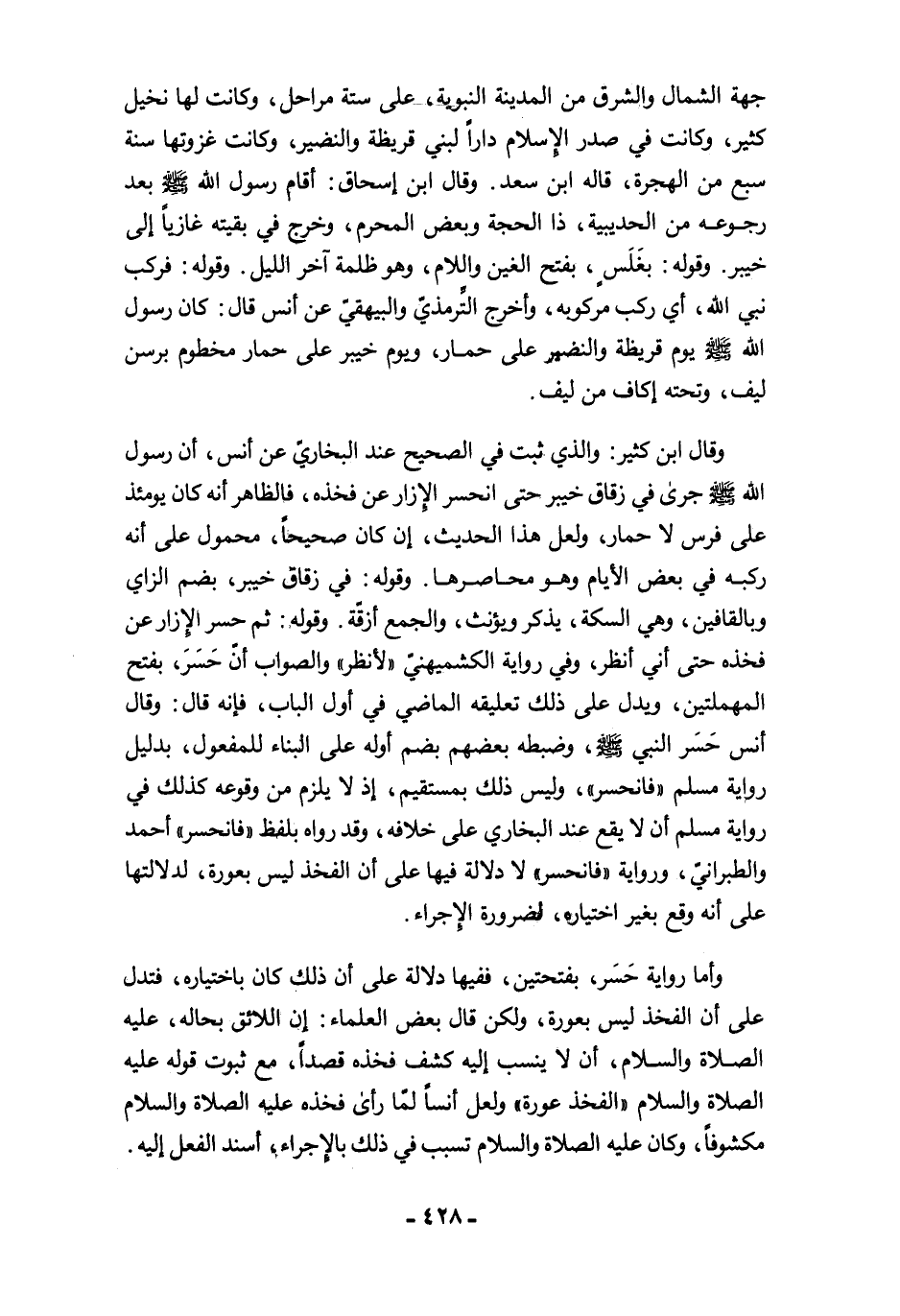 وقال ابن كثير: والذي ثبت في الصحيح عند البخاريّ عن أنس، أن رسول الله -صلى الله عليه وسلم- جرى في زقاق خيبر حتى انحسر الإزار عن فخذه، فالظاهر أنه كان يومئذ على فرس لا حمار، ولعل هذا الحديث، ان كان صحيحًا، محمول على أنه ركبه في بعض الأيام وهو محاصرها. وقوله: في زقاق خيبر، بضم الزاي وبالقافين، وهي السكة، يذكر ويؤنث، والجمع أزقة. وقوله -صلى الله عليه وسلم-: ثم حسر الإزار عن فخذه حتى أني انظر، وفي رواية الكشميهنيّ "لأنظر" والصواب أنّ حَسَرَ، بفتح المهملتين، ويدل على ذلك تعليقه الماضي في أول الباب، فإنه قال: وقال أنس حَسَر النبي -صلى الله عليه وسلم-، وضبطه بعضهم بضم أوله على المبناء للمفعول، بدليل رواية مسلم "فانحسر"، وليس ذلك بمستقيم، إذ لا يلزم من وقوعه كذلك في رواية مسلم أن لا يقع عند البخاريّ على خلافه، وقد رواه بلفظ "فانحسر" أحمد والطبرانيّ، ورواية "فانحسر" لا دلالة فيها على أن الفخذ ليس بعورة، لدلالتها على أنه وقع بغير اختياره، لضرورة الإجراء.