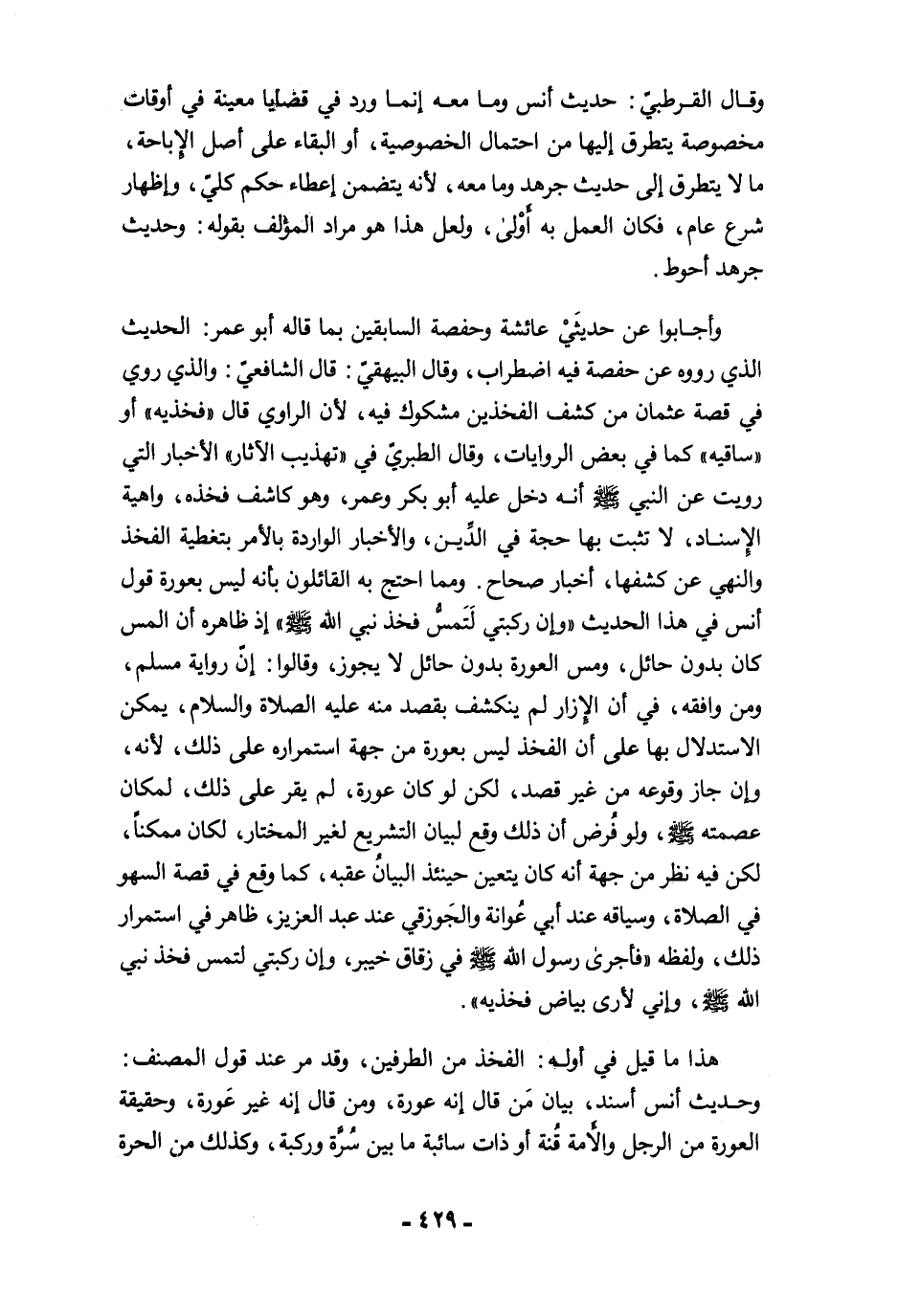 وقال القرطبيّ: حديث أنس وما معه إنما ورد في قضايا معينة في أوقات مخصوصة يتطرق إليها من احتمال الخصوصية، أو البقاء على أصل الإباحة، ما لا يتطرق إلى حديث جرهد وما معه؛ لأنه يتضمن إعطاء حكم كليّ، وإظهار شرع عام، فكان العمل به أَوْلى، ولعل هذا هو مراد المؤلف بقوله: وحديث جرهد أحوط.