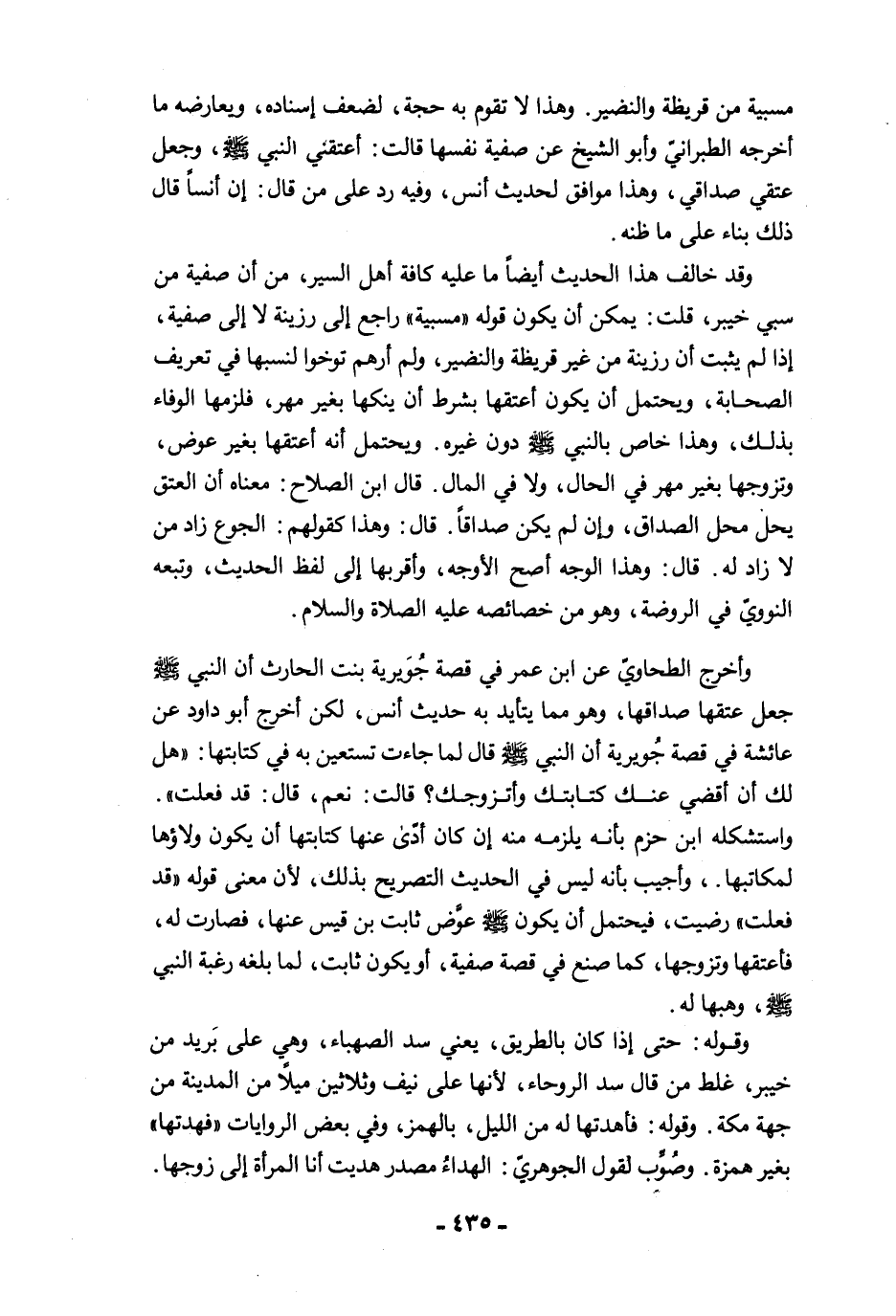 مسبية من قريظة والنضير. وهذا لا تقوم به حجة، لضعف إسناده، ويعارضه ما أخرجه الطبرانيّ وأبو الشيخ عن صفية نفسها قالت: أعتقتي النبي -صلى الله عليه وسلم-، وجعل عتقي صداقي، وهذا موافق لحديث أنس، وفيه رد على من قال: إن أنسًا قال ذلك بناء على ما ظنه.