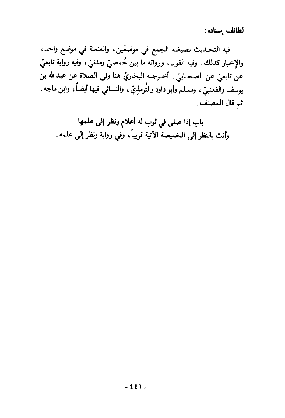 فيه التحديث بصيغة الجمع في موضعَين، والعنعنة في موضع واحد، والإخبار كذلك. وفيه القول، ورواته ما بين حُمصيّ ومدنيّ، وفيه رواية تابعيّ عن تابعيّ عن الصحابيّ. أخرجه البخاريّ هنا وفي الصلاة عن عبد الله بن يوسف والقعنبيّ، ومسلم وأبو داود والتِّرمذِيّ، والنَّسائيّ فيها أيضًا، وابن ماجه.
