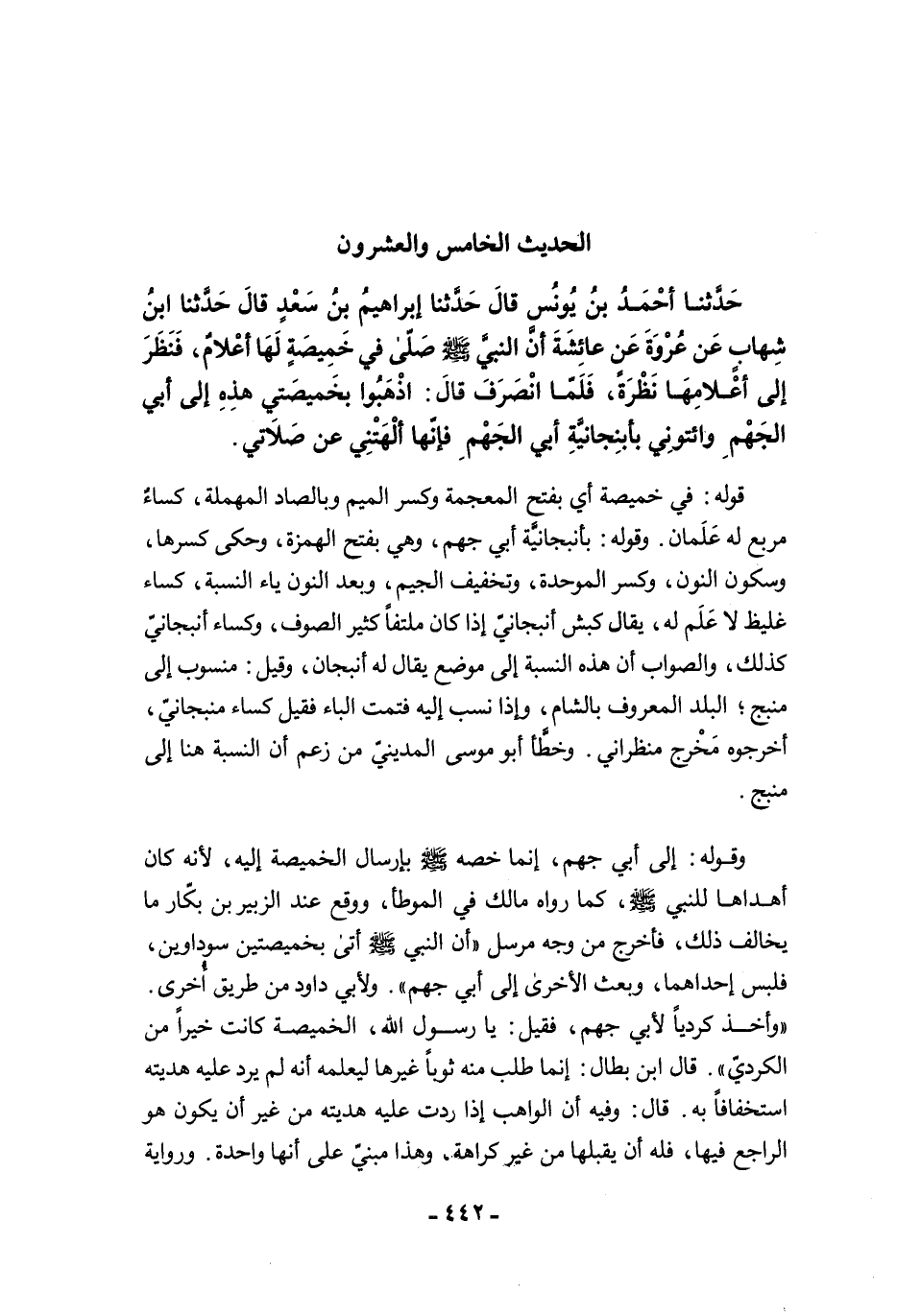 قوله: في خميصة أي بفتح المعجمة وكسر الميم وبالصاد المهملة، كساء مربع له عَلَمان. وقوله: بأنبجانيَّة أبي جهم، وهي بفتح الهمزة، وحكى كسرها، وسكون النون، وكسر الموحدة، وتخفيف الجيم، وبعد النون ياء النسبة، كساء غليظ لا عَلَم له، يقال كبش أنبجانيّ إذا كان ملتفًا كثير الصوف، وكساء أنبجانيّ كذلك، والصواب أن هذه النسبة إلى موضع يقال له أنبجان، وقيل: منسوب إلى منبج؛ البلد المعروف بالشام، وإذا نسب إليه فتمت الباء فقيل كساء منبجانيّ، أخرجوه مَخْرج منظراني. وخطَّأ أبو موسى المدينيّ من زعم أن النسبة هنا إلى منبج.