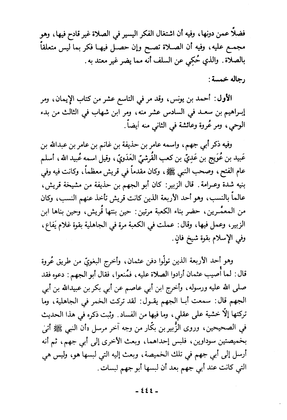 وفيه ذكر أبي جهم، واسمه عامر بن حذيفة بن غانم بن عامر بن عبد الله بن عَبيد بن عُوَيج بن عَدِيّ بن كعب القُرشيّ العَدَويّ، وقيل اسمه عُبيد الله، أسلم عام الفتح، وصحب النبي -صلى الله عليه وسلم-، وكان مقدمًا في قريش معظمًا، وكانت فيه وفي بنيه شدة وعرامة. قال الزبير: كان أبو الجهم بن حذيفة من مشيخة قريش، عالمًا بالنسب، وهو أحد الأربعة الذين كانت قريش تأخذ عنهم النسب، وكان من المعمَّرين، حضر بناء الكعبة مرتين: حين بنتها قُريش، وحين بناها ابن الزبير، وعمل فيها، وقال: عملت في الكعبة مرة في الجاهلية بقوة غلام يَفاع، وفي الإِسلام بقوة شيخ فانٍ.