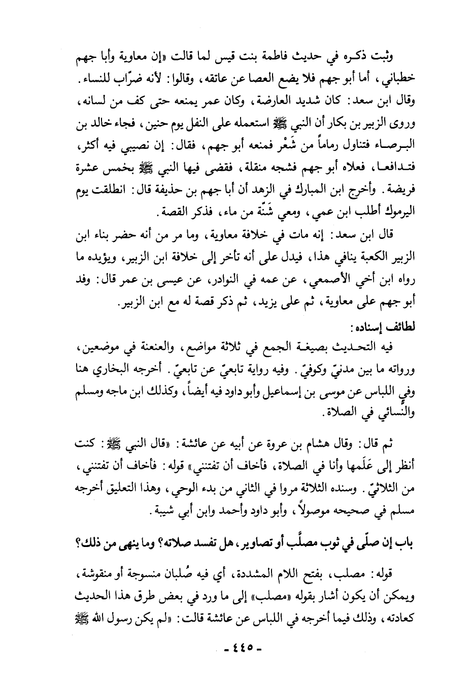 ثم قال: وقال هشام بن عروة عن أبيه عن عائشة: "قال النبي -صلى الله عليه وسلم-: كنت انظر إلى عَلَمها وأنا في الصلاة، فأخاف أن تفتنني" قوله: فأخاف أن تفتنني، من الثلاثيّ. وسنده الثلاثة مروا في الثاني من بدء الوحي، وهذا التعليق أخرجه مسلم في صحيحه موصولًا، وأبو داود وأحمد وابن أبي شيبة.