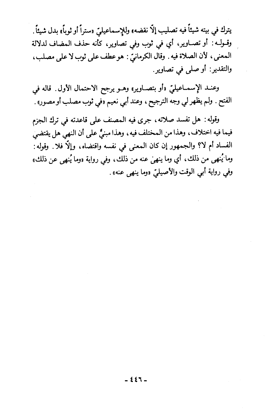 يترك في بيته شيئًا فيه تصليب إلَّا نقضه" وللإسماعيليّ "سترًا أو ثوبًا" بدل شيئاً. وقوله: أو تصاوير، أي في ثوب وفي تصاوير، كأنه حذف المضاف لدلالة المعنى؛ لأن الصلاة فيه. وقال الكرمانيّ: هو عطف على ثوب لا على مصلب، والتقدير: أو صلى في تصاوير.
