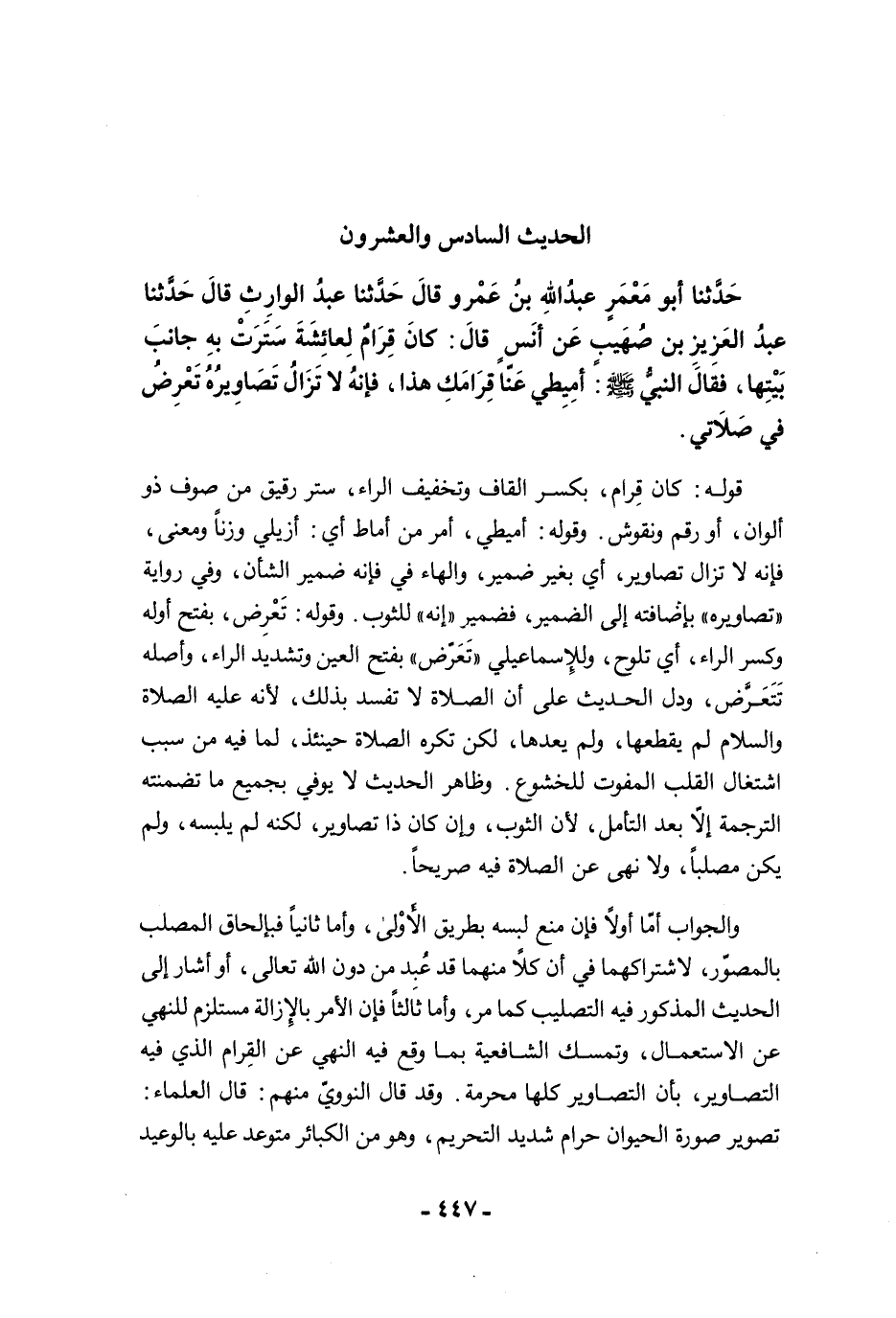 حَدَّثَنَا أَبُو مَعْمَرٍ عَبْدُ اللَّهِ بْنُ عَمْرٍو قَالَ حَدَّثَنَا عَبْدُ الْوَارِثِ قَالَ حَدَّثَنَا عَبْدُ الْعَزِيزِ بْنُ صُهَيْبٍ عَنْ أَنَسٍ قَالَ: كَانَ قِرَامٌ لِعَائِشَةَ سَتَرَتْ بِهِ جَانِبَ بَيْتِهَا فَقَالَ النَّبِيُّ -صلى الله عليه وسلم-: "أَمِيطِي عَنَّا قِرَامَكِ هَذَا، فَإِنَّهُ لاَ تَزَالُ تَصَاوِيرُهُ تَعْرِضُ فِي صَلاَتِي".