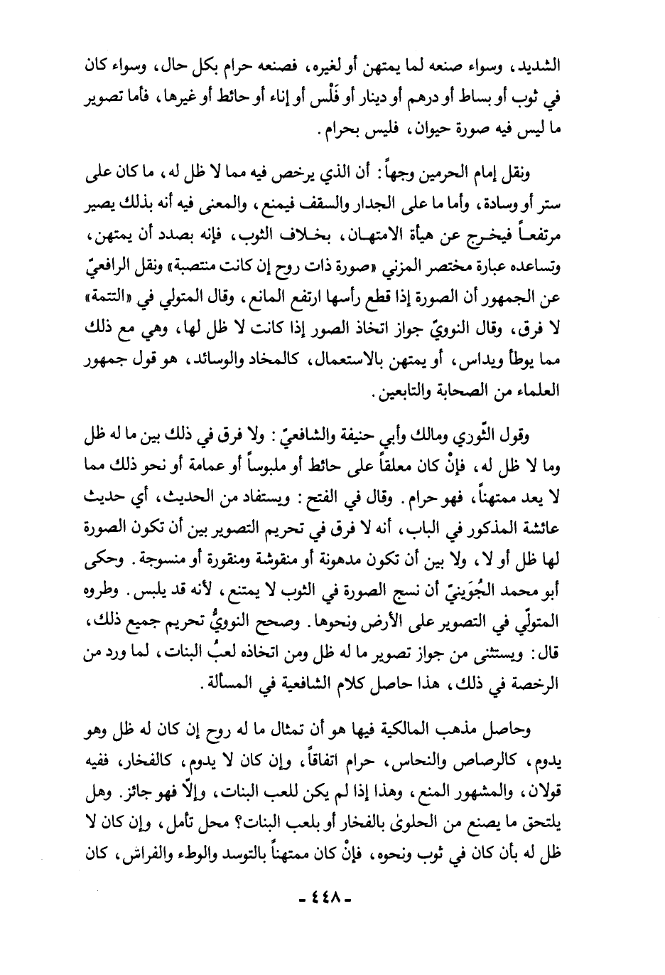 وقول الثّوري ومالك وأبي حنيفة والشافعيّ: ولا فرق في ذلك بين ما له ظل وما لا ظل له، فإنْ كان معلقًا على حائط أو ملبوسًا أو عمامة أو نحو ذلك مما لا يعد ممتهنًا، فهو حرام. وقال في الفتح: ويستفاد من الحديث، أي حديث عائشة المذكور في الباب، أنه لا فرق في تحريم التصوير بين أن تكون الصورة لها ظل أو لا، ولا بين أن تكون مدهونة أو منقوشة ومنقورة أو منسوجة. وحكى أبو محمد الجُوَينيّ أن نسج الصورة في الثوب لا يمتنع؛ لأنه قد يلبس. وطروه المتولّي في التصوير على الأرض ونحوها. وصحح النوويُّ تحريم جميع ذلك، قال: ويستثنى من جواز تصوير ما له ظل ومن اتخاذه لعبُ البنات، لما ورد من الرخصة في ذلك، هذا حاصل كلام الشافعية في المسألة.