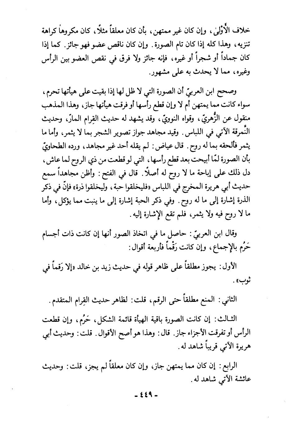 وصحح ابن العربيّ أن الصورة التي لا ظل لها إذا بقيت على هيأتها تحرم، سواء كانت مما يمتهن أم لا وإن قطع رأسها أو فرقت هيأتها جاز، وهذا المذهب منقول عن الزُّهريّ، وقواه النوويّ، وقد يشهد له حديث القِرام المارّ، وحديث النَّمرقة الآتي في اللباس. وقيد مجاهد جواز تصوير الشجر بما لا يثمر، وأما ما يثمر فالحقه بما له روح. قال عياض: لم يقله أحد غير مجاهد، ورده الطحاويّ بأن الصورة لمّا أبيحت بعد قطع رأسها، التي لو قطعت من ذي الروح لما عاش، دل ذلك على إباحة ما لا روح له أصلًا. قال في الفتح: وأظن مجاهدًا سمع حديث أبى هريرة المخرج في اللباس "فليخلقوا حبَّة، وليخلقوا ذرة" فإنّ في ذكر الذرة إشارة إلى ما له روح. وفي ذكر الحبة إشارة إلى ما ينبت مما يؤكل، وأما ما لا روح فيه ولا يثمر، فلم تقع الإشارة إليه.