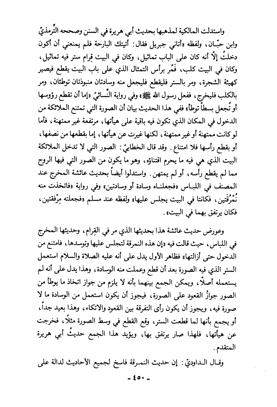 واستدلت المالكية لمذهبها بحديث أبي هريرة في السنن وصححه التِّرمذيّ وابن حبّان، ولفظه "أتاني جبريل فقال: أتيتك البارحة فلم يمنعني أن أكون دخلتُ إلَّا أنه كان على الباب تماثيل، وكان في البيت قِرام ستر فيه تماثيل، وكان في البيت كلب، فَمُر برأس التمثال الذي على باب البيت يقطع فيصير كهيئة الشجرة، ومر بالستر فليقطع فليجعل منه وسادتان منبوذتان توطئان، ومر بالكلب فليخرج، ففعل رسول الله -صلى الله عليه وسلم-" وفي رواية النَّسائيّ "إما أن تقطع رؤوسها أو تُجعل بسطًا توطأ" ففي هذا الحديث بيان أن الصورة التي تمتنع الملائكة من الدخول في المكان الذي تكون فيه باقية على هيأتها، مرتفعة غير ممتهنة، فأما لو كانت ممتهنة أو غير ممتهنة، لكنها غيرت عن هيأتها، إما بقطعها من نصفها، أو بقطع رأسها فلا امتناع. وقد قال الخطابيّ: الصور التي لا تدخل الملائكة البيت الذي هي فيه ما يحرم اقتناؤه، وهو ما يكون من الصور التي فيها الروح مما لم يقطع رأسه، أو لم يمتهن. واستدلوا أيضًا بحديث عائشة المخرج عند المصنف في اللباس "فجعلناه وسادة أو وسادتين" وفي رواية "فاتخذت منه نُمْرُقَتين، فكانتا في البيت يجلس عليها" ولفظه عند مسلم "فجعلته مِرْفقتين، فكان يرتفق بهما في البيت".