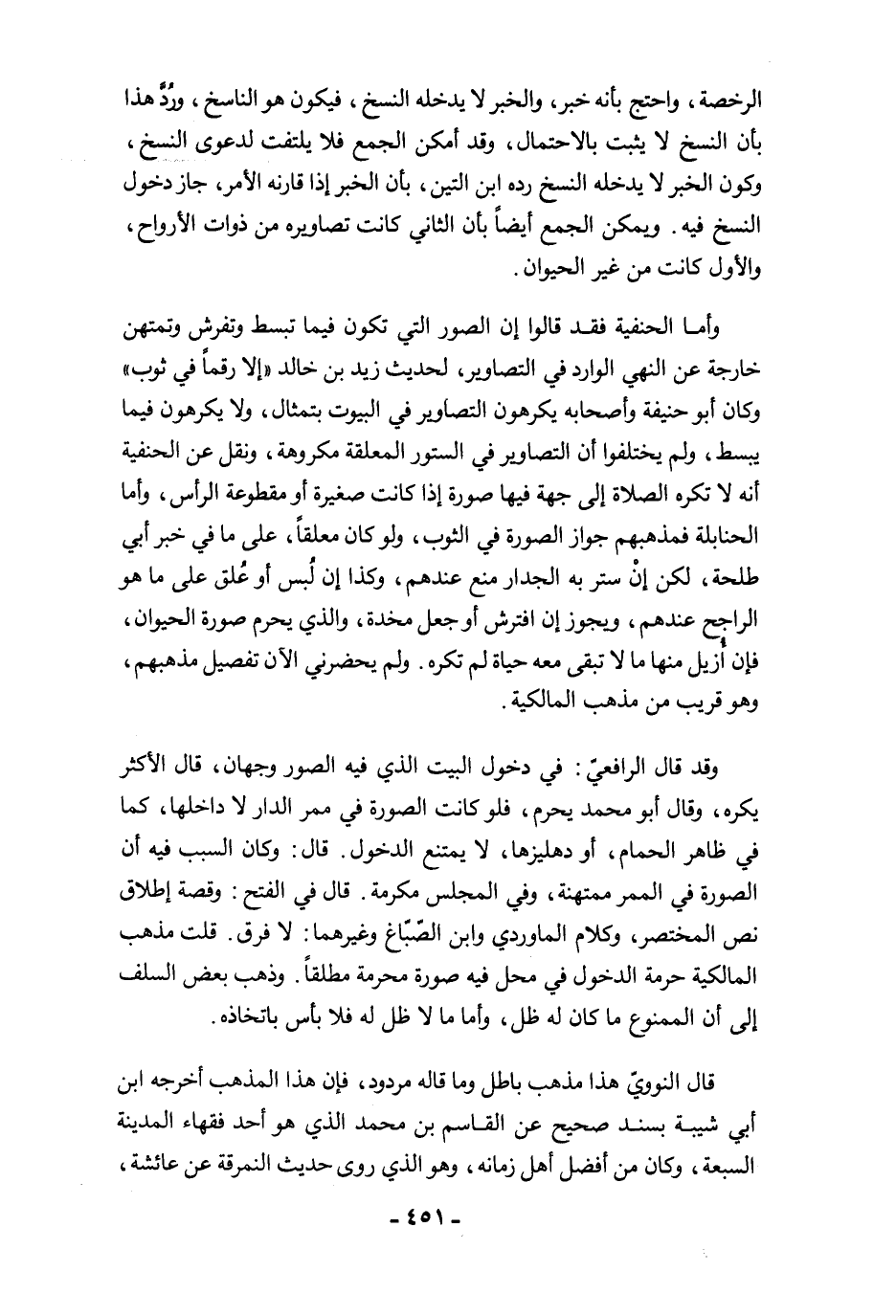 وقد قال الرافعيّ: في دخول البيت الذي فيه الصور وجهان، قال الأكثر يكره، وقال أبو محمد يحرم، فلو كانت الصورة في ممر الدار لا داخلها، كما في ظاهر الحمام، أو دهليزها، يمتنع الدخول. قال: وكان السبب فيه أن الصورة في الممر ممتهنة، وفي المجلس مكرمة. قال في الفتح: وقصة إطلاق نص المختصر، وكلام الماوردي وابن الصّبّاغ وغيرهما: لا فرق. قلت مذهب المالكية حرمة الدخول في محل فيه صورة محرمة مطلقًا. وذهب بعض السلف إلى أن الممنوع ما كان له ظل، وأما ما لا ظل له فلا بأس باتخاذه.