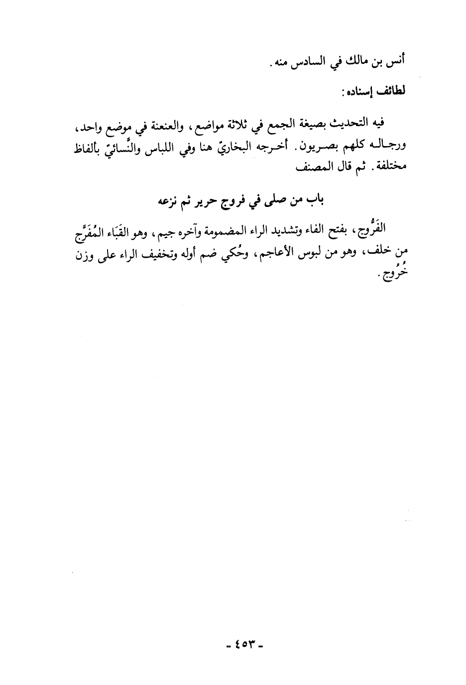فيه التحديث بصيغة الجمع في ثلاثة مواضع، والعنعنة في موضع واحد، ورجاله كلهم بصريون. أخرجه البخاريّ هنا وفي اللباس والنَّسائيّ بألفاظ مختلفة. ثم قال المصنف
