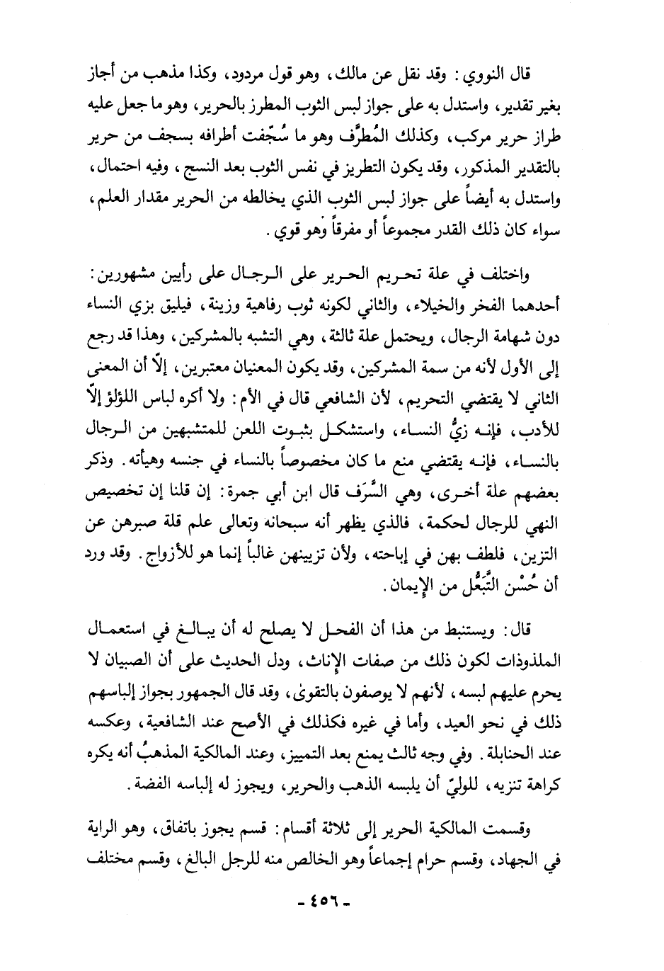 قال النووي: وقد نقل عن مالك، وهو قول مردود، وكذا مذهب من أجاز بغير تقدير، واستدل به على جواز لبس الثوب المطرز بالحرير، وهو ما جعل عليه طراز حرير مركب، وكذلك المُطرَّف وهو ما سُجّفت أطرافه بسجف من حرير بالتقدير المذكور، وقد يكون التطريز في نفس الثوب بعد النسج، وفيه احتمال، واستدل به أيضًا على جواز لبس الثوب الذي يخالطه من الحرير مقدار العلم، سواء كان ذلك القدر مجموعًا أو مفرقًا وهو قوي.