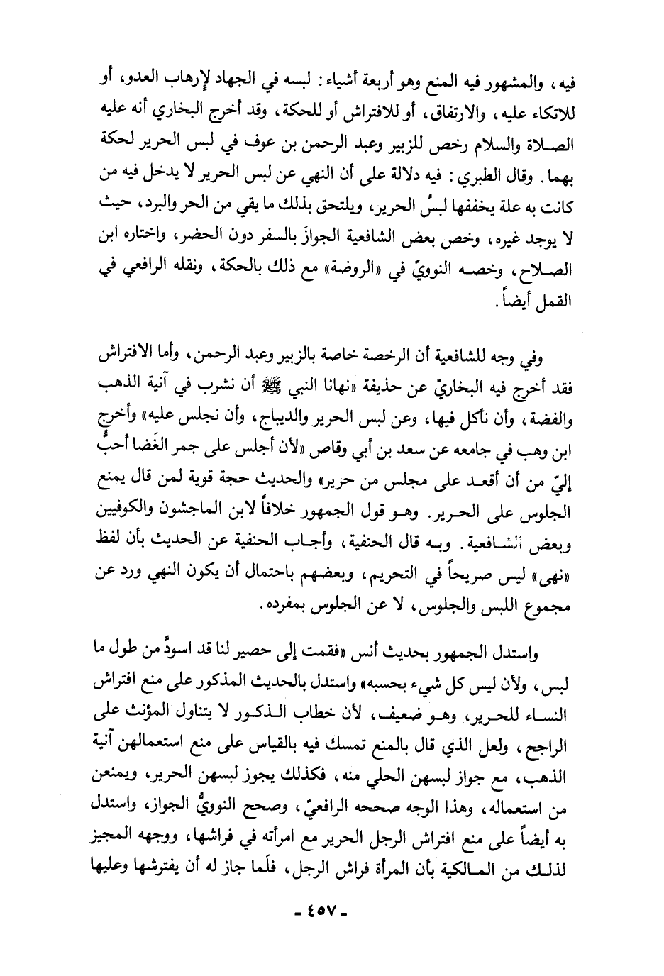 واستدل الجمهور بحديث أنس "فقمت إلى حصير لنا قد اسودَّ من طول ما لبس، ولأن ليس كل شيء بحسبه" واستدل بالحديث المذكور على منع افتراش النساء للحرير، وهو ضعيف؛ لأن خطاب الذكور لا يتناول المؤنث على الراجح، ولعل الذي قال بالمنع تمسك فيه بالقياس على منع استعمالهن آنية الذهب، مع جواز لبسهن الحلي منه، فكذلك يجوز لبسهن الحرير، ويمنعن من استعماله، وهذا الوجه صححه الرافعيّ، وصحح النوويُّ الجواز، واستدل به أيضًا على منع افتراش الرجل الحرير مع امرأته في فراشها، ووجهه المجيز لذلك من المالكية بأن المرأة فراش الرجل، فلَما جاز له أن يفترشها وعليها