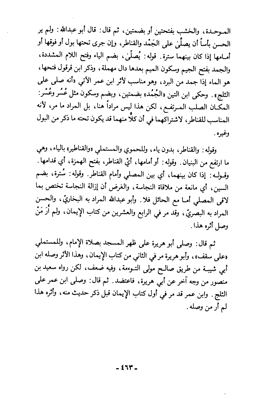 الموحدة، والخشب بفتحتين أو بضمتين، ثم قال: قال أبو عبد الله: ولم ير الحسن بأسًا أن يصلَّى على الجَمْد والقناطر، وإن جرى تحتها بول أو فوقها أو أمامها إذا كان بينهما سترة. قوله: يُصلَّى، بضم الياء وفتح اللام المشددة، والجمد بفتح الجيم وسكون الميم بعدها قال مهملة، وذكر ابن قرقول فتحها، هو الماء إذا جمد من البرد، وهو مناسب لأثر ابن عمر الآتي "أنه صلى على الثلج". وحكى ابن التين "الجُمُد" بضمتين، وبضم وسكون مثل عُسُر وعُسْر: المكان الصلب المرتفع، لكن هذا ليس مرادًا هنا، بل المراد ما مرّ؛ لأنه المناسب للقناطر، لاشتراكهما في أن كلاًّ منهما قد يكون تحته ما ذكر من البول وغيره.