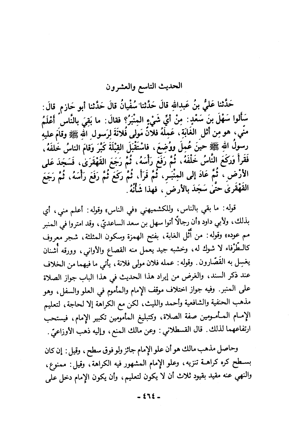 حَدَّثَنَا عَلِيُّ بْنُ عَبْدِ اللَّهِ قَالَ حَدَّثَنَا سُفْيَانُ قَالَ حَدَّثَنَا أَبُو حَازِمٍ قَالَ: سَأَلُوا سَهْلَ بْنَ سَعْدٍ: مِنْ أَيِّ شَيْءٍ الْمِنْبَرُ؟ فَقَالَ: مَا بَقِيَ بِالنَّاسِ أَعْلَمُ مِنِّي هُوَ مِنْ أَثْلِ الْغَابَةِ، عَمِلَهُ فُلاَنٌ مَوْلَى فُلاَنَةَ لِرَسُولِ اللَّهِ -صلى الله عليه وسلم-، وَقَامَ عَلَيْهِ رَسُولُ اللَّهِ -صلى الله عليه وسلم- حِينَ عُمِلَ، وَوُضِعَ، فَاسْتَقْبَلَ الْقِبْلَةَ كَبَّرَ وَقَامَ النَّاسُ خَلْفَهُ، فَقَرَأَ وَرَكَعَ وَرَكَعَ النَّاسُ خَلْفَهُ، ثُمَّ رَفَعَ رَأْسَهُ، ثُمَّ رَجَعَ الْقَهْقَرَى، فَسَجَدَ عَلَى الأَرْضِ، ثُمَّ عَادَ إِلَى الْمِنْبَرِ، ثُمَّ قَرَأَ ثُمَّ رَكَعَ، ثُمَّ رَفَعَ رَأْسَهُ، ثُمَّ رَجَعَ الْقَهْقَرَى حَتَّى سَجَدَ بِالأَرْضِ، فَهَذَا شَأْنُهُ.