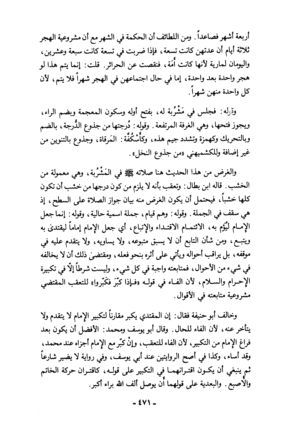 والغرض من هذا الحديث هنا صلاته -صلى الله عليه وسلم- في المَشْرُبة، وهي معمولة من الخشب. قاله ابن بطال: وتعقب بأنه لا يلزم من كون درجها من خشب أن تكون كلها خشبًا، فيحتمل أن يكون الغرض منه بيان جواز الصلاة على السطح، إذ هي سقف في الجملة. وقوله: وهم قيام، جملة اسمية حالية، وقوله: إنما جعل الإِمام ليُؤَم به، الائتمام الاقتداء والإِتباع، أي جعل الإِمام إمامًا ليقتدى به ويتبع، ومن شأن التابع أن لا يسبق متبوعه، ولا يساويه، ولا يتقدم عليه في موقفه، بل يراقب أحواله ويأتي على أثره بنحو فعله، ومقتضى ذلك أن لا يخالفه في شيء من الأحوال، فمتابعته واجبة في كل شيء، وليست شرطًا إلّا في تكبيرة الإحرام والسلام؛ لأن الفاء في قوله "فإذا كبّرَ فكَبّروا" للتعقب المقتضي مشروعية متابعته في الأقوال.