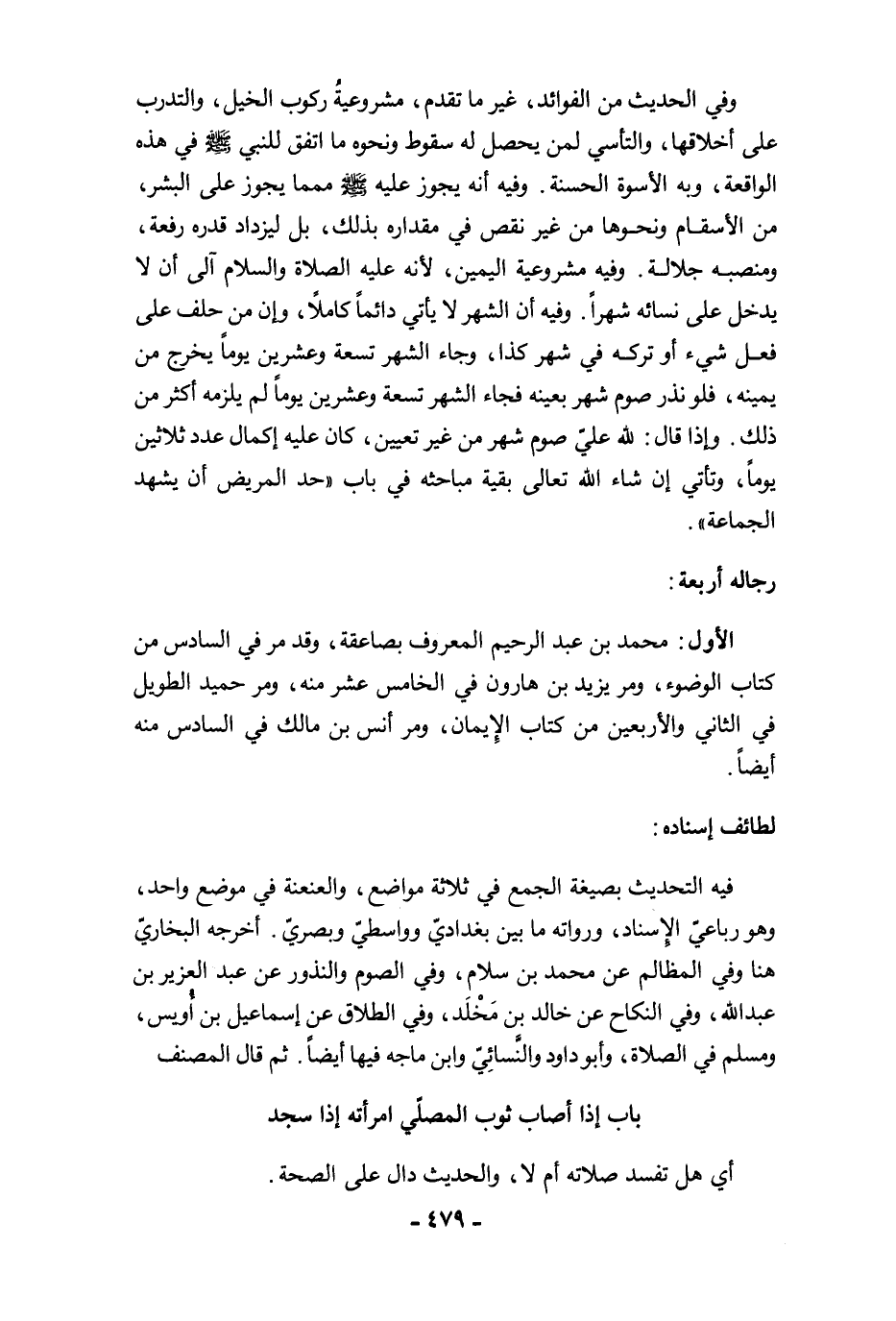 فيه التحديث بصيغة الجمع في ثلاثة مواضع، والعنعنة في موضع واحد، وهو رباعيّ الإسناد، ورواته ما بين بغداديّ وواسطيّ وبصريّ. أخرجه البخاريّ هنا وفي المظالم عن محمد بن سلام، وفي الصوم والنذور عن عبد العزير بن عبد الله، وفي النكاح عن خالد بن مَخْلَد، وفي الطلاق عن إسماعيل بن أُويس، ومسلم في الصلاة، وأبو داود والنَّسائِيّ وابن ماجه فيها أيضًا، ثم قال المصنف: