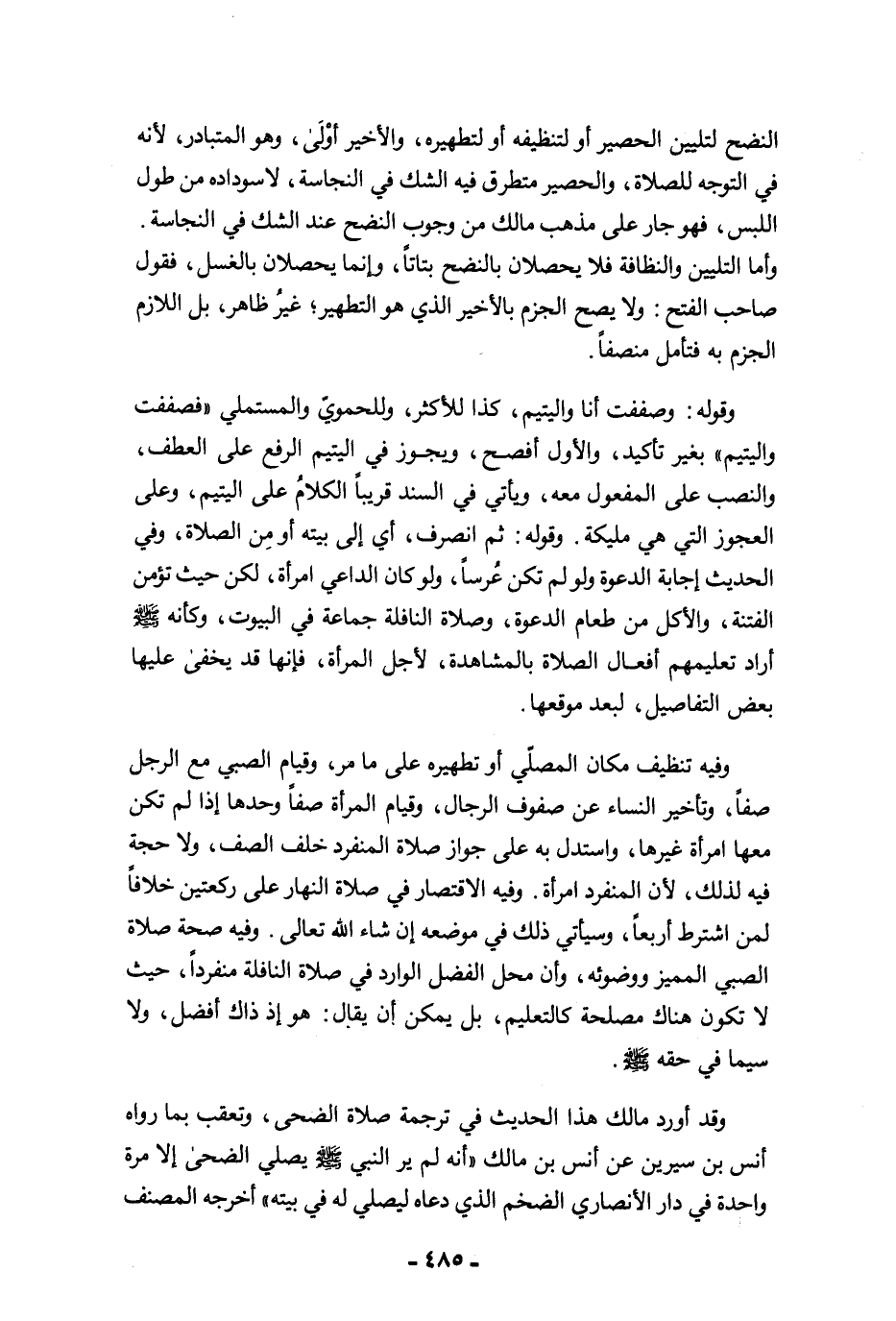 وقد أورد مالك هذا الحديث في ترجمة صلاة الضحى، وتعقب بما رواه أنس بن سيرين عن أنس بن مالك "أنه لم ير النبي -صلى الله عليه وسلم- يصلي الضحى إِلا مرة واحدة في دار الأنصاري الضخم الذي دعاه ليصلي له في بيته" أخرجه المصنف