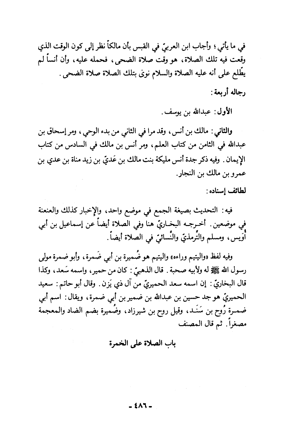 في ما يأتي؛ وأجاب ابن العربيّ في القبس بأن مالكًا نظر إلى كون الوقت الذي وقعت فيه تلك الصلاة، هو وقت صلاة الضحى، فحمله عليه، وأن أنسًا لم يطّلع على أنه عليه الصلاة والسلام نوى بتلك الصلاة صلاة الضحى.