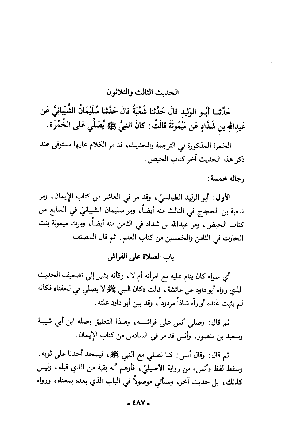 الأول: أبو الوليد الطَّيالسيّ، وقد مرّ في العاشر من كتاب الإِيمان، ومرّ شعبة بن الحجاج في الثالث منه أيضًا، ومرّ سليمان الشيبانيّ في السابع من كتاب الحيض، ومرّ عبد الله بن شداد في الثامن منه أيضًا، ومرت ميمونة بنت الحارث في الثامن والخمسين من كتاب العلم. ثم قال المصنف