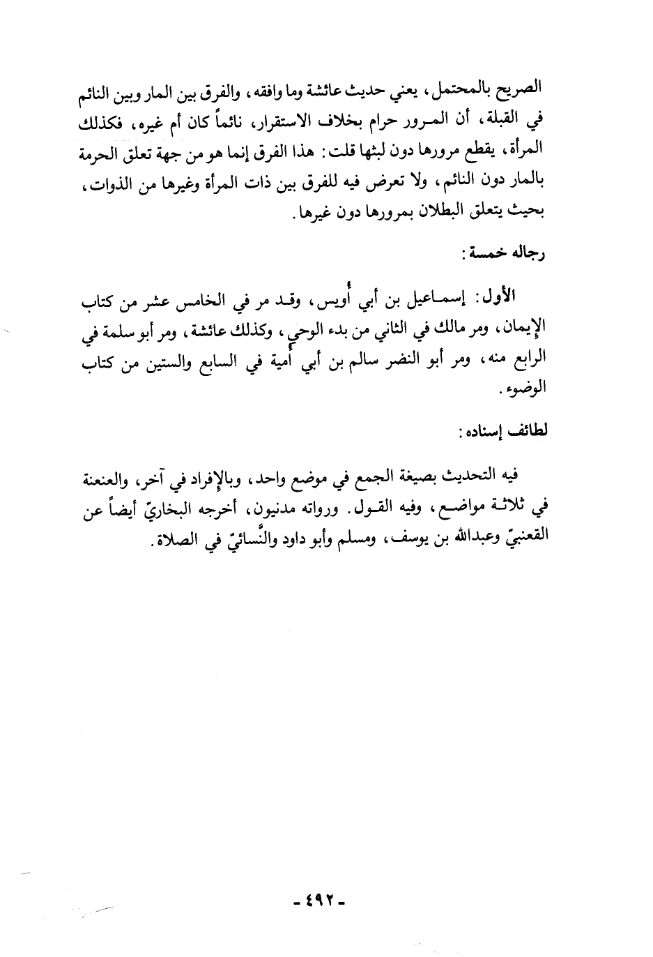 الصريح بالمحتمل، يعني حديث عائشة وما وافقه، والفرق بين المار وبين النائم في القبلة، أن المرور حرام بخلاف الاستقرار، نائمًا كان أم غيره، فكذلك المرأة، يقطع مرورها دون لبثها قلت: هذا الفرق إنما هو من جهة تعلق الحرمة بالمار دون النائم، ولا تعرض فيه للفرق بين ذات المرأة وغيرها من الذوات، بحيث يتعلق البطلان بمرورها دون غيرها.