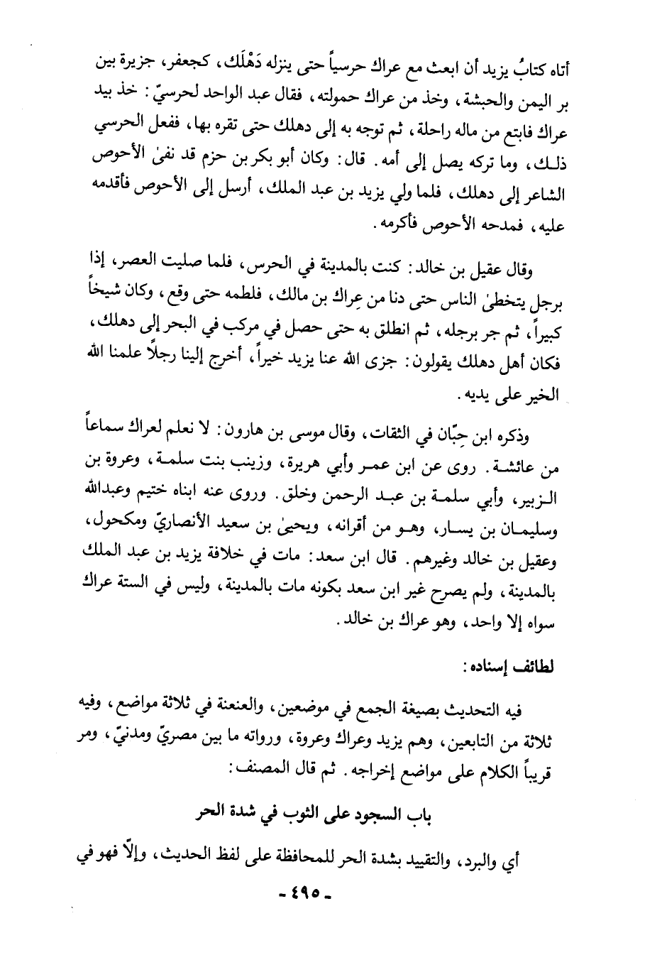 وقال عقيل بن خالد: كنت بالمدينة في الحرس، فلما صليت العصر، إذا برجل يتخطى الناس حتى دنا من عِراك بن مالك، فلطمه حتى وقع، وكان شيخًا كبيرًا، ثم جر برجله، ثم انطلق به حتى حصل في مركب في البحر إلى دهلك، فكان أهل دهلك يقولون: جزى الله عنا يزيد خيرًا، أخرج إلينا رجلًا علمنا الله الخير على يديه.