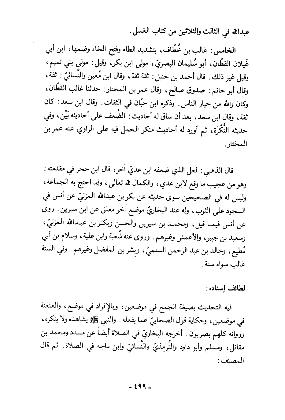 الخامس: غالب بن خُطّاف، بتشديد الطاء وفتح الخاء وضمها، ابن أبي غَيلان القطّان، أبو سُليمان البصريّ، مولى ابن بكر، وقيل: مولى بني تميم، وقيل غير ذلك. قال أحمد بن حنبل: ثقة ثقة، وقال ابن مُعين والنَّسائيّ: ثقة، وقال أبو حاتم: صدوق صالح، وقال عمر بن المختار: حدثنا غالب القطّان، وكان والله من خيار الناس. وذكره ابن حبّان في الثقات. وقال ابن سعد: كان ثقة، وقال ابن سعد، بعد أن ساق له أحاديث: الضَّعف على أحاديثه بَيِّن، وفي حديثه النُّكْرَة، ثم أورد له أحاديث منكر العمل فيه على الراوي عنه عمر بن المختار.