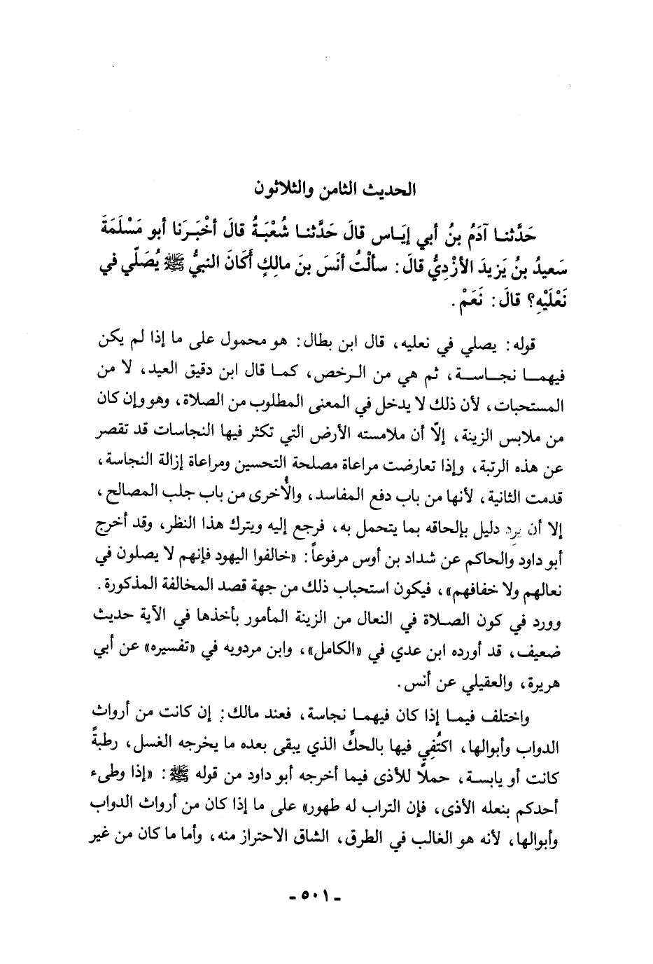 حَدَّثَنَا آدَمُ بْنُ أَبِي إِيَاسٍ قَالَ حَدَّثَنَا شُعْبَةُ قَالَ أَخْبَرَنَا أَبُو مَسْلَمَةَ سَعِيدُ بْنُ يَزِيدَ الأَزْدِيُّ قَالَ: سَأَلْتُ أَنَسَ بْنَ مَالِكٍ أَكَانَ النَّبِيُّ -صلى الله عليه وسلم- يُصَلِّي فِي نَعْلَيْهِ؟ قَالَ: نَعَمْ.