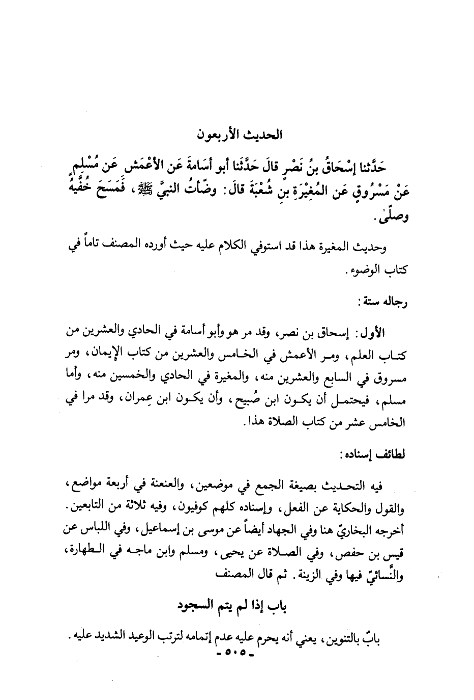 الأول: إسحاق بن نصر، وقد مرّ هو وأبو أسامة في الحادي والعشرين من كتاب العلم، ومرّ الأعمش في الخامس والعشرين من كتاب الإيمان، ومرّ مسروق في السابع والعشرين منه، والمغيرة في الحادي والخمسين منه، وأما مسلم، فيحتمل أن يكون ابن صُبيح، وأن يكون ابن عِمران، وقد مرا في الخامس عشر من كتاب الصلاة هذا.
