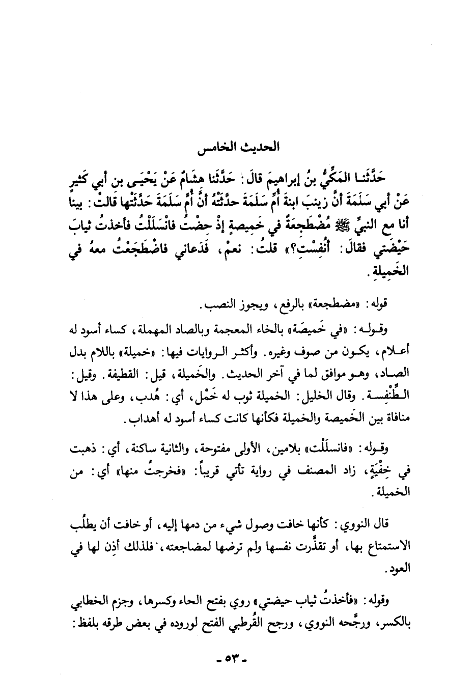 حَدَّثَنَا الْمَكِّيُّ بْنُ إِبْرَاهِيمَ قَالَ: حَدَّثَنَا هِشَامٌ عَنْ يَحْيَى بْنِ أَبِي كَثِيرٍ عَنْ أَبِي سَلَمَةَ أَنَّ زَيْنَبَ ابْنَةَ أُمِّ سَلَمَةَ حَدَّثَتْهُ أَنَّ أُمَّ سَلَمَةَ حَدَّثَتْهَا قَالَتْ: بَيْنَا أَنَا مَعَ النَّبِيِّ -صلى الله عليه وسلم- مُضْطَجِعَةً فِي خَمِيصَةٍ إِذْ حِضْتُ، فَانْسَلَلْتُ فَأَخَذْتُ ثِيَابَ حِيضَتِي فَقَالَ: "أَنُفِسْتِ". قُلْتُ: نَعَمْ. فَدَعَانِي فَاضْطَجَعْتُ مَعَهُ فِي الْخَمِيلَةِ.